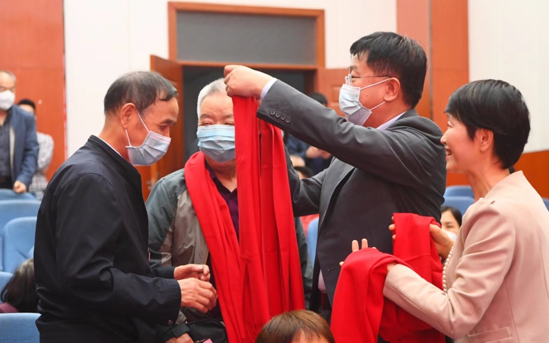 庆祝活动开始,孙国华、范九利为老寿星们送上象征吉祥幸福的红围巾。