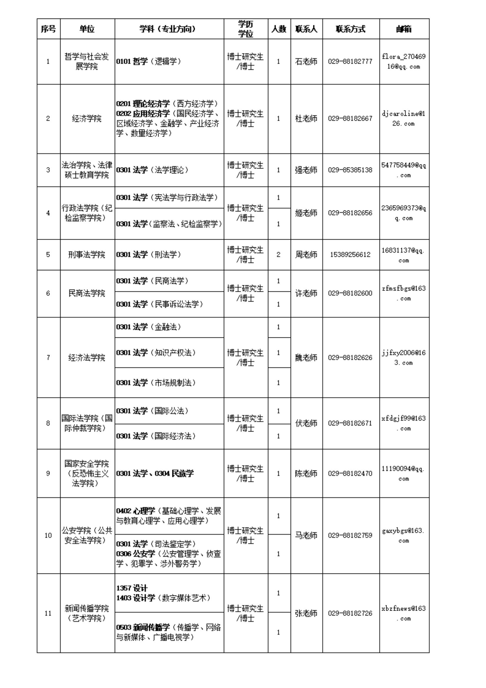 各类别人才引进、招聘具体条件可咨询人事处,联系人:王老师,电话029-88182596。