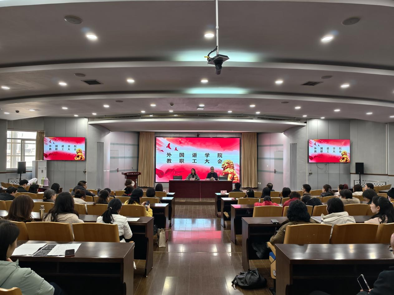 1月17日,外国语学院召开全院教职工大会,全院教职工参加会议,学院党委书记陈梦琦主持会议。 会议集中学习了2026年全国教育工作会议精神,对寒假及下学期重点工作进行部署,凝聚全院共识,为“十五五”开局之年教育教学工作高质量推进奠定坚实基础。 院长陈河对寒假期间深化教育教学改革和推动教学科研双向赋能重点工作进行安排部署。他强调,要利用假期窗口,做好新学期教学准备、科研项目推进、访企拓岗等各项工作,确保假期开学无缝衔接;要关爱学生成长“不断线”,做好学生假期社会实践、专业实习与学科竞赛备赛的指导与保障;利用假期充电蓄能,规划教学、科研、管理等工作,为新一年发展夯实基础。 陈梦琦在讲话中肯定了学院在党建工作、人才队伍建设、本科教学、科研工作和学生工作等领域取得的亮点成绩,指出这些成绩凝聚了全院教职工的辛勤付出,是学院开拓进取、追求卓越精神的全面体现。她表示,2026年是“十五五”规划落地的第一年,要开好局起好步,加强各项工作的有组织推进,以“开拓进取、追求卓越”的精神状态,一步一个脚印,把战略目标转化为学院高质量发展的现实,为学校事业发展贡献力量。 会议还对2026年春节期间正风肃纪工作进行了提醒,要求全体教职工切实增强纪律意识与规矩意识,确保清廉过节。本次大会全面梳理了学院年度发展情况,明确了后续工作方向,为进一步推动学院高质量发展凝聚了共识、夯实了基础。 (供稿:外国语学院 撰稿:崔玮 审核:陈梦琦)