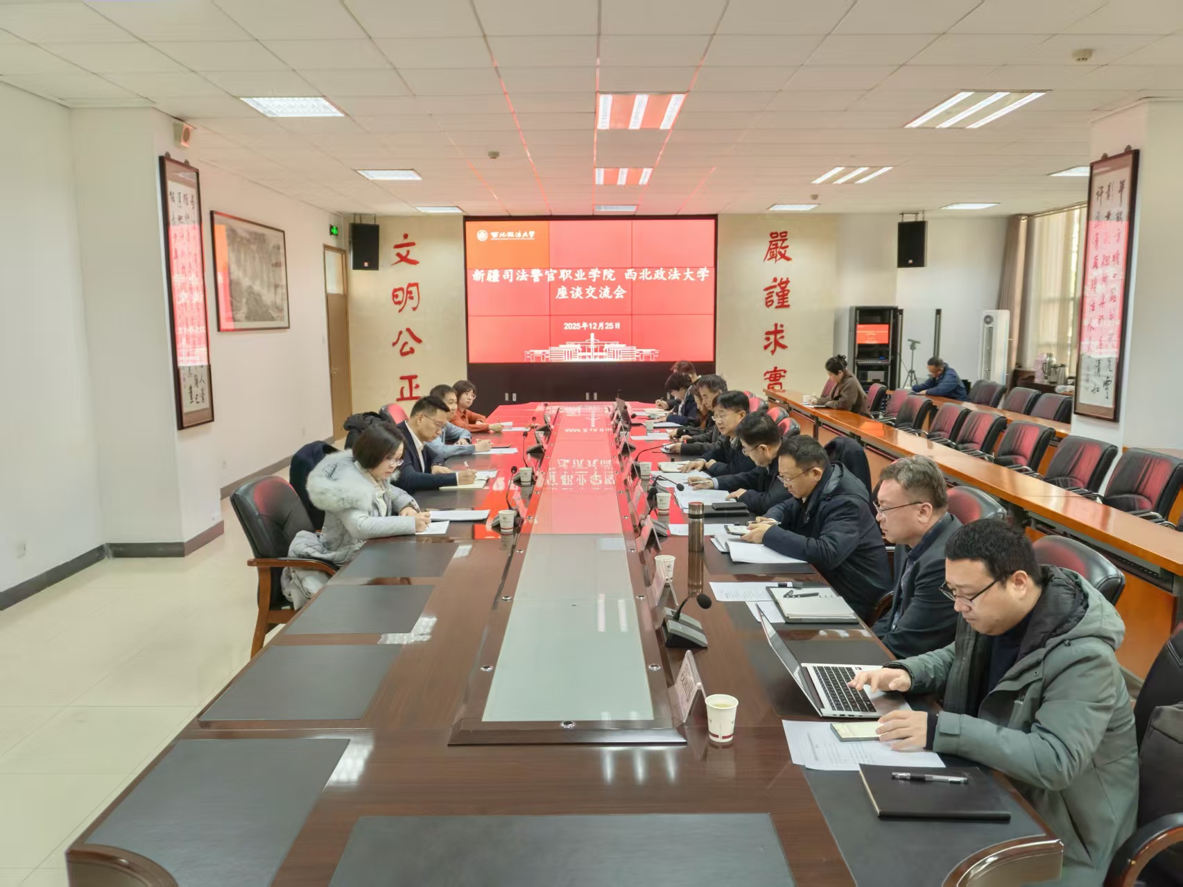 12月25日上午,新疆司法警官职业学院院长张峥一行来校调研,校长范九利出席座谈会,副校长张荣刚主持。 范九利对张峥一行的到来表示热烈欢迎,并简要介绍了beat365在办学历史、学科特色、人才培养等方面的基本情况。他指出,新疆司法警官职业学院作为我国司法行政教育领域的特色院校,是培养高素质司法行政专门人才的重要阵地。此次调研,双方聚焦学科专业优化、人才培养模式、科研创新发展等关键领域,既创造了互学互鉴、共促提升的宝贵机会,更彰显了新疆司法警官职业学院追求高质量发展的远见卓识,为两校深化合作、携手共进注入了强劲动力。 张峥对beat365长期以来对新疆司法警官职业学院的帮助和支持表示感谢。他表示,新疆司法警官职业学院立足新疆区位特点,构建了“政治素养+专业技能”双核培养模式,但面临师资队伍建设、人才梯队培养、教学管理效能提升、边疆治理等挑战。beat365平台官方网站的许多经验和探索具有重要的参考价值,希望未来能继续保持密切沟通,建立长效合作机制,在师资互访、教学资源共享、科研项目合作、培训业务联动等方面开展实质性的合作。 与会人员围绕师资梯队培养、教学管理人才培养、科研建设及创新发展、社会服务等方面内容进行了交流讨论。 会前,张峥一行参观了校史馆与习近平法治思想“三进”展室。 发展规划与学科建设处、教务处、人事处、科研处、培训中心、行政法学院(纪检监察学院)、中华法系研究院相关负责人参加座谈会。 (供稿:党政办 撰稿:杜镇宁 审核:刘淑宝)