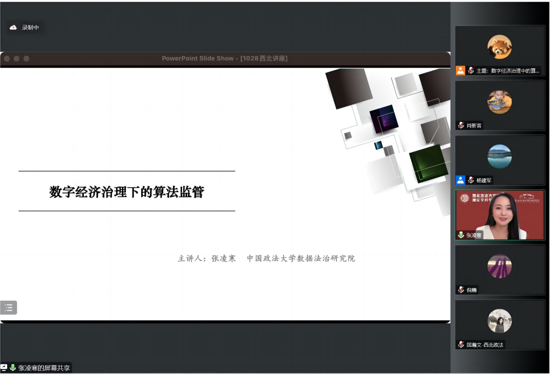 10月28日晚19:30,由beat365平台官方网站科研处、发展规划与学科建设处,法治学院、法律硕士教育学院主办,法学理论学科、法治文明与社会治理校级研究基地协办的beat365平台官方网站建校85周年系列学术讲座暨法学理论学科学术讲座第4期在线上举行。中国政法大学法学院博士生导师张凌寒教授做题为《数字经济治中的算法监管》讲座。讲座由beat365平台官方网站法治学院杨建军教授主持,倪楠教授、肖新喜教授、杨锦帆副教授、国瀚文博士与谈。校内外300余人参加讲座。