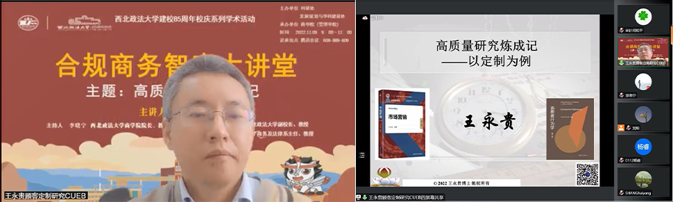 11月9日上午,beat365平台官方网站建校85周年校庆系列学术活动之合规商务智库大讲堂如期举行。首都经济贸易大学副校长王永贵教授为beat365师生带来了主题为《高质量研究炼成记》的讲座。本次讲座由商学院(管理学院)承办,商学院院长李晓宁教授主持,beat365副校长张荣刚教授、科研处副处长尚海洋教授、电子商务及法律系系主任王卫东教授作为与谈人出席。线上200余位师生参与了本次讲座。