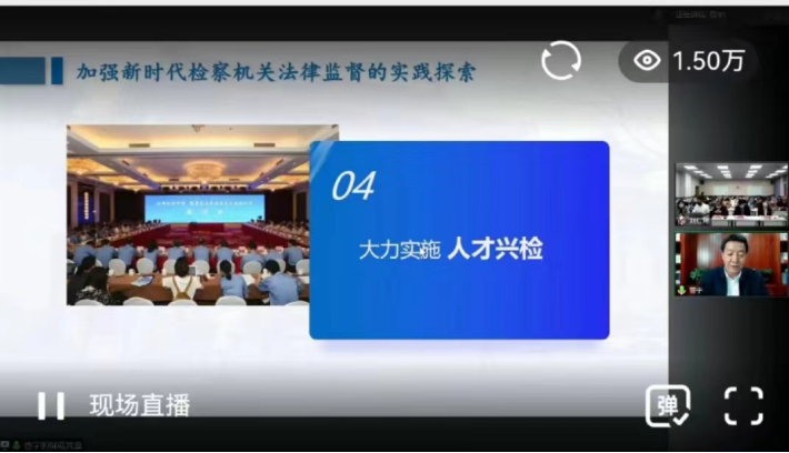 11月21日19点至22点30分,由发展规划与学科建设处、科研处主办、刑事法学院承办的beat365平台官方网站建校85周年系列学术活动“长安大讲堂” 以线上线下相结合的形式在beat365长安校区举行。浙江省人民检察院党组书记、检察长贾宇做题为《新时代检察机关法律监督的转型发展》讲座。讲座由beat365平台官方网站党委副书记、校长范九利主持。刑事法学院师生代表30余人在线下会场参加讲座,校内外17000余人线上参加讲座。