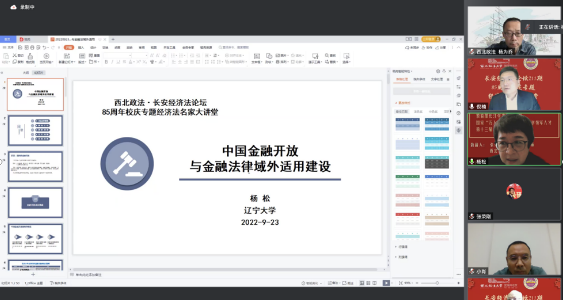 9月23日14时30分,由经济法学院(知识产权学院)承办的第二百一十一期长安经济法学论坛暨八十五周年校庆专题经济法名家大讲堂于线上举行。本期论坛特邀辽宁大学副校长、经济法、国际法博士生导师、第十三届全国人大代表杨松教授为主讲人,发表题为《中国金融开放与金融法律域外适用建设》的主题讲座。论坛由经济法学院院长倪楠教授主持,副校长、博士生导师张荣刚教授致辞,经济法学院博士生导师强力教授、杨为乔副教授、《法律科学》兼职副主编肖新喜教授应邀与谈发言。二百余名研究生及多位实务届人士积极参与,认真聆听讲座。