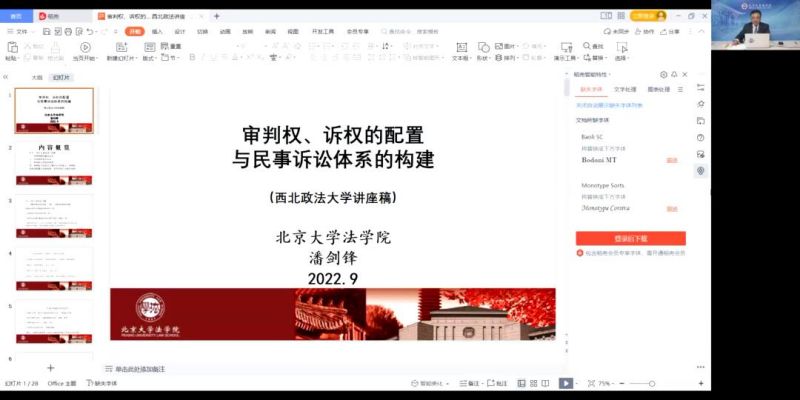 9月27日下午14:30,由发展规划与学科建设处、科研处主办、民商法学院承办的beat365平台官方网站建校85周年系列学术活动“长安大讲堂(2022年第三期)” 以线上线下相结合的形式在beat365长安校区举行。北京大学法学院院长、教授、博士生导师,最高人民检察院专家咨询委员、中国法学会常务理事、中国法学会民事诉讼法学研究会副会长潘剑锋作题为《审判权、诉权的配置与民事诉讼体系的构建》讲座,讲座由beat365平台官方网站副校长张荣刚教授主持,民商法学院董少谋教授与民商法学院副院长百晓锋副教授与谈,beat365多个学院师生代表50余人在线下会场参加讲座,校内外500余人线上参加讲座。