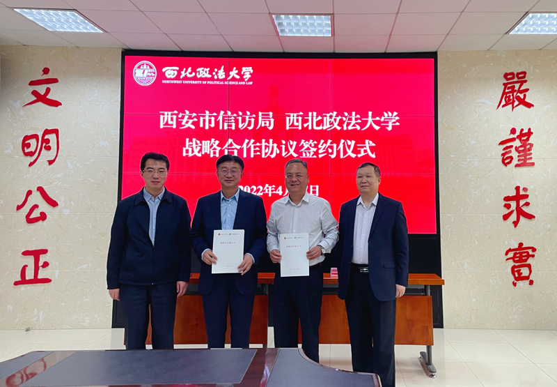 签约仪式上,张军政与王增武分别代表学校和西安市信访局签署战略合作协议。范九利、张蔚见证签约仪式。