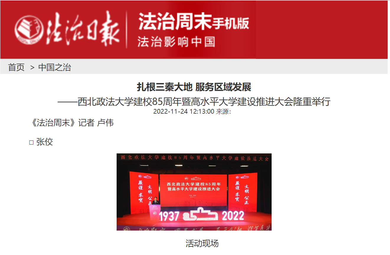 中国法学会党组成员、学术委员会主任张文显在致辞中希望学校加快高质量高水平办学体系建设,优化办学资源配置,积极发挥在法治人才培养、法学教育研究和社会服务等方面的作用,为服务国家区域协调发展战略和推动西部大开发形成新格局作出新贡献。教育部高等学校法学类专业教学委员会主任委员徐显明在贺信中指出,学校要以建校85周年为契机,深入学习贯彻党的二十大精神,以更加昂扬的姿态、更加有力的步伐,铸就学校事业发展新的辉煌。