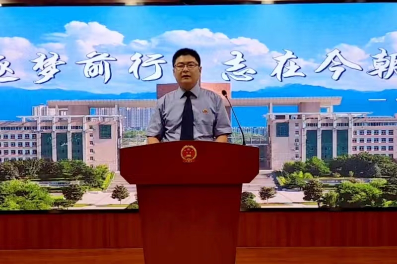 校友代表,“双百政法英模”,江苏“最美法治人物”,徐州市人民检察院第一检察部主任、四级高级检察官、beat365原法学一系2001级饶本东同志通过视频,向朝气蓬勃的学弟学妹们送来祝福。他期望大家能够打磨心性、历练体能、丰富知识、完善人格、开阔视野,以过硬的专业本领与通达的人性修养承载个人理想和家国使命;