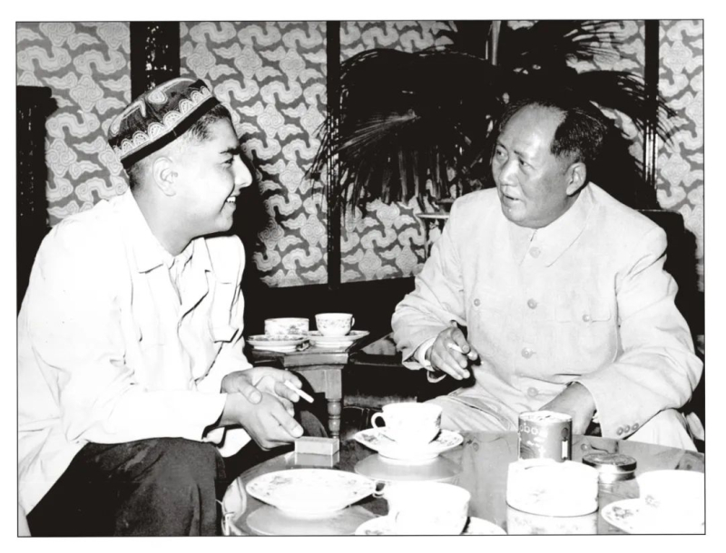 他说:“我见到毛主席时心跳得很快,浑身一直冒汗,当时会议室里有许多中央领导同志,周恩来、刘少奇、邓小平等会见时都在座,毛主席让我坐在他的身边,周总理就与我调换了位置。主席问了我许多问题。当他得知我们是中央政法干部学校西北分校新疆班的师生时,就问我们能不能听懂汉语,我说配有四个翻译。他又问,西安很热我们是否受得了,维吾尔民族有经常吃肉的习惯,在学校我们能不能吃得上肉,我都向毛主席一一作了回答。毛主席还赞扬我汉语水平好。出厅堂照相时,毛主席一直拉着我的手不放,集体合影时,毛主席让我和他坐在了一起。”
