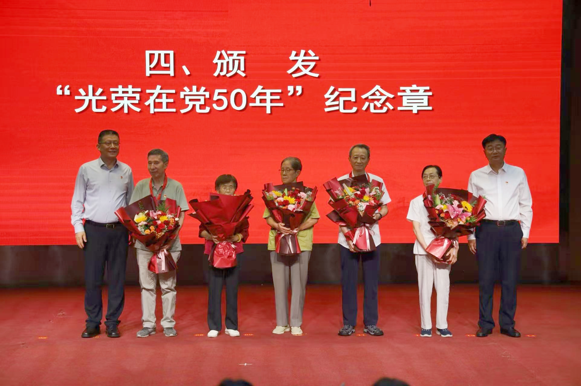 薪火相传守初心。大会举行了庄重的“光荣在党50年”纪念章颁发仪式。赵万东、范九利为王喆、周玉英、赵玲、姜淮超、韩利英等5位党龄满50年的老党员代表佩戴纪念章。学生党员敬献鲜花,全体参会人员以经久不息的热烈掌声表达深深的敬意。