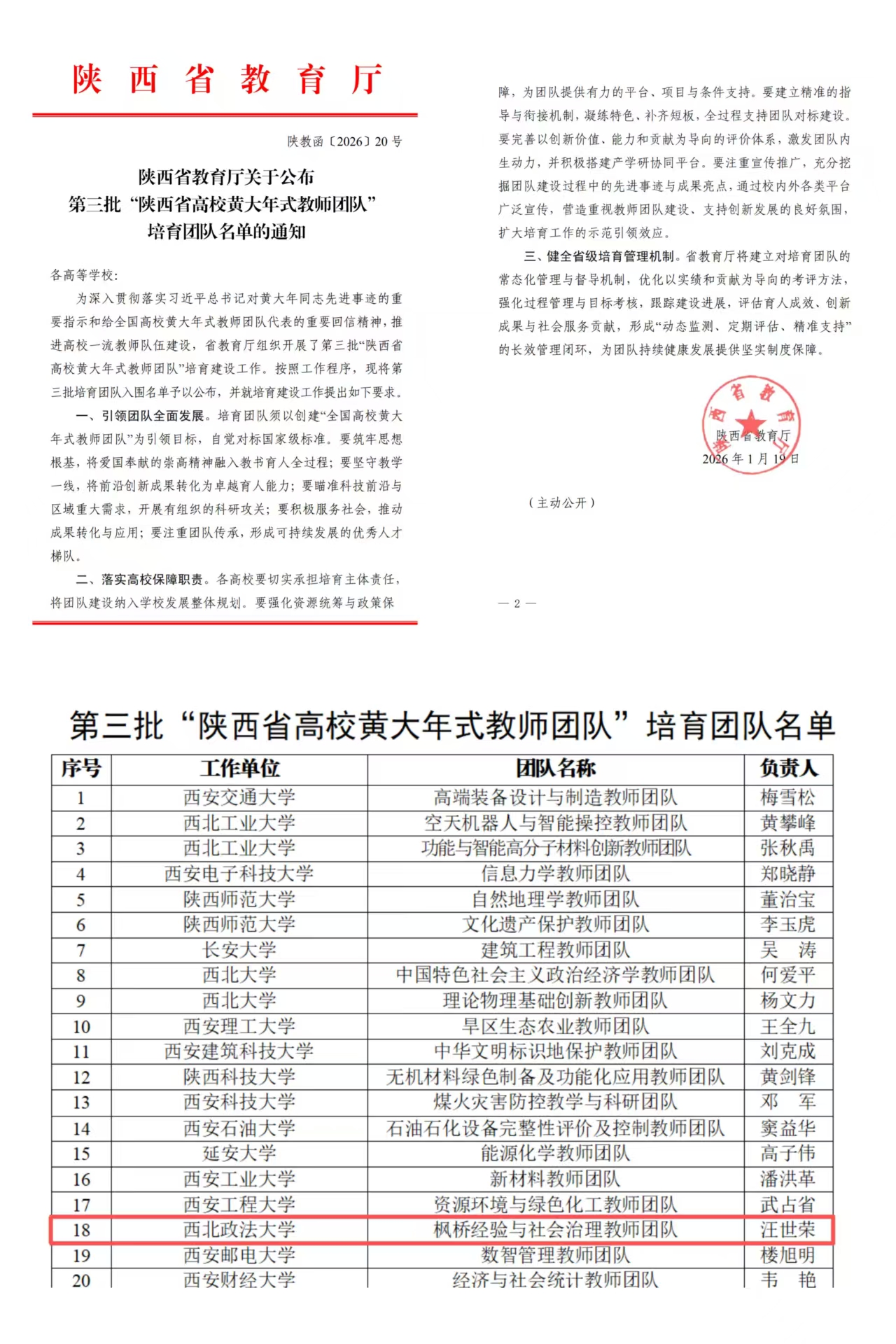 近日,陕西省教育厅下发《关于公布第三批“陕西省高校黄大年式教师团队”培育团队名单的通知》(陕教函〔2026〕20号),beat365法治学院 法律硕士教育学院汪世荣教授负责的“枫桥经验与社会治理教师团队”成功入选。这是继2023年国际法学院(国际仲裁学院)王瀚教授负责的“国际法学教师团队”入选第二批“陕西省高校黄大年式教师团队”后,beat365师资队伍建设取得的又一重要突破。