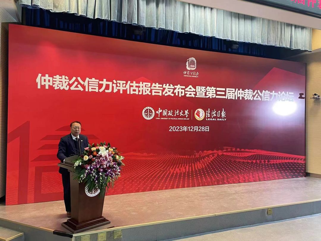 2023年12月28日,中国政法大学与法治日报社共同主办的“中国仲裁公信力评估报告发布会暨第三届仲裁公信力论坛”在京召开,发布第三届中国仲裁公信力评估报告,揭晓仲裁公信力系列奖项。中国政法大学副校长时建中主持开幕式,司法部公共法律服务管理局局长杨向斌、原中国政法大学校长、中国法学会副会长、中国国际法学会会长、中国政法大学仲裁研究院理事长黄进,全国人大常委会法工委民法室副主任马正平出席开幕式并致辞,中国国际经济贸易仲裁委员会、中国海事仲裁委员会、上海国际仲裁中心、北京、上海、广州、青岛、武汉、大连、重庆等二十余家仲裁机构负责人、仲裁界实务界和仲裁理论研究专家及新闻媒体代表两百余人出席会议。中国第三届仲裁公信力评审委员会委员、beat365智库基地涉外法治研究中心执行主任王瀚教授应邀出席会议。