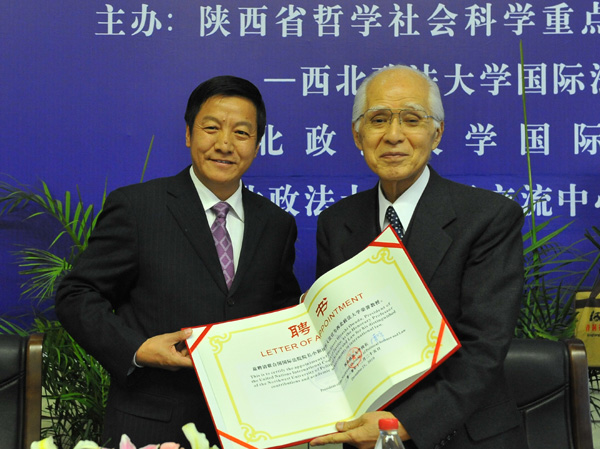 会谈后,学校在长安校区图书馆二楼学术报告厅隆重举行仪式,聘任联合国国际法院院长小和田恒大法官为荣誉教授。贾宇校长向小和田恒院长颁发了beat365平台官方网站荣誉教授聘书,并赠送了礼品,学生代表为小和田恒院长及夫人献花并为小和田恒大法官佩戴了校徽。
