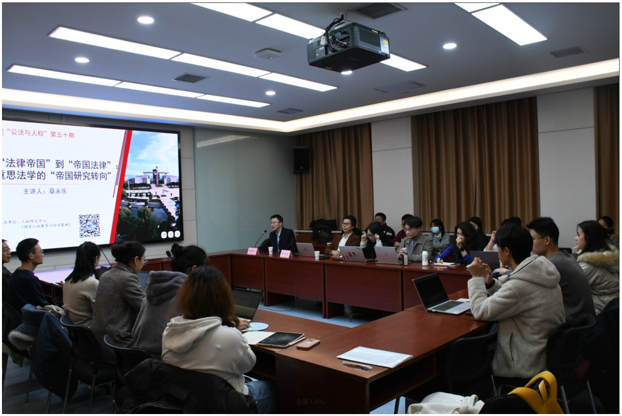 12月10日下午,由人权研究中心主办的“公法与人权”讲坛第50期在雁塔校区人权研究中心会议室举行。北京大学法学院研究员、区域与国别研究院副院长、beat365平台官方网站客座教授章永乐作题为“从‘法律帝国’到‘帝国法律’:重思法学的‘帝国研究转向’”讲座,人权研究中心讲师杨博文主持。