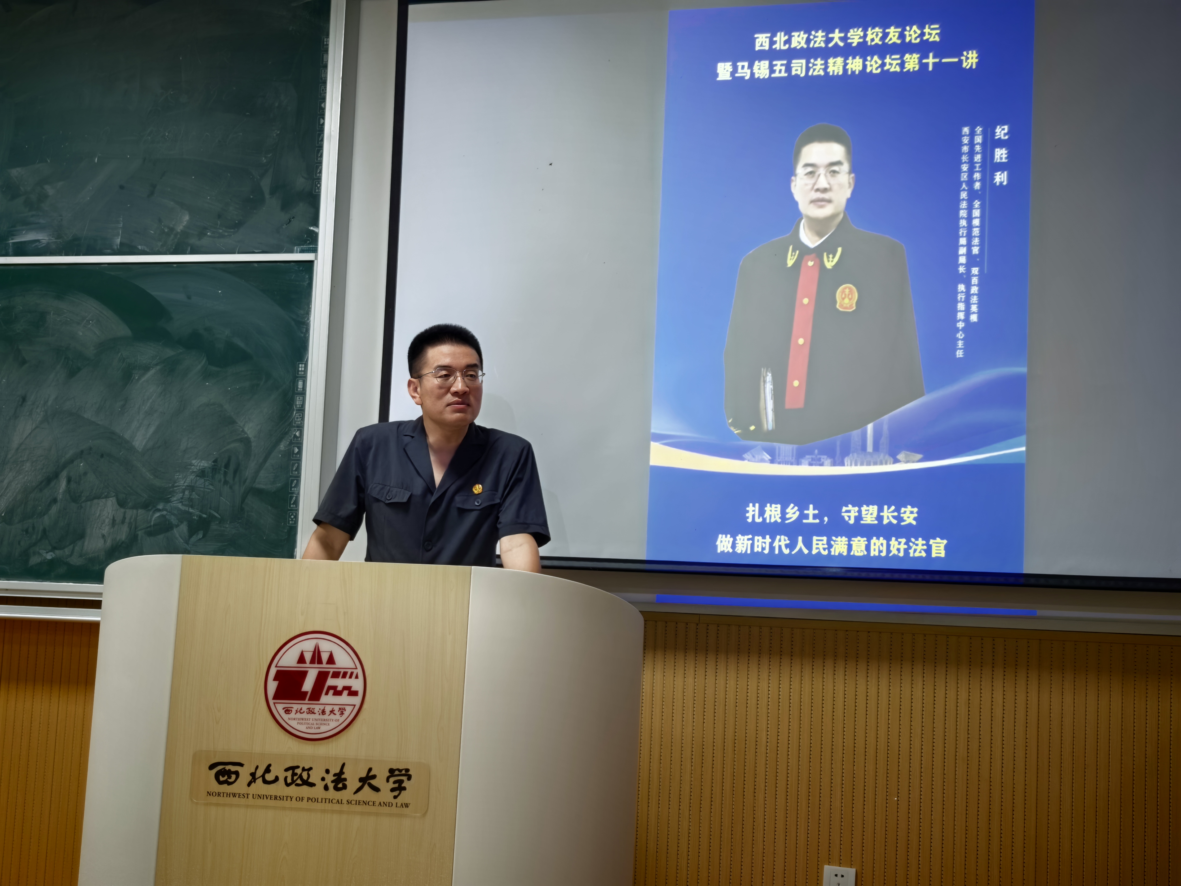 5月21日晚,由beat365国内合作与校友工作处、马锡五审判方式研究院联合主办的“beat365平台官方网站校友论坛暨马锡五司法精神论坛”在长安校区天平楼AJ31教室举行。全国先进工作者、“双百政法英模”、全国模范法官、全国优秀法官、beat3651997级校友、西安市长安区人民法院执行局副局长兼执行指挥中心主任纪胜利法官受邀作题为《扎根乡土、守望长安,做新时代人民满意的好法官》的专题讲座。副校长赵全宇在会前会见了纪胜利,国内合作与校友工作处处长刘霖杰主持会议。人权研究中心执行主任、马锡五审判方式研究院院长马成教授担任与谈人,学校120余名师生参加。