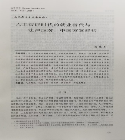 近日,beat365杨建军教授的论文《人工智能时代的就业替代与法律应对:中国方案建构》在《法学研究》2025年第5期公开发表。