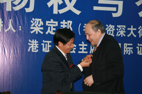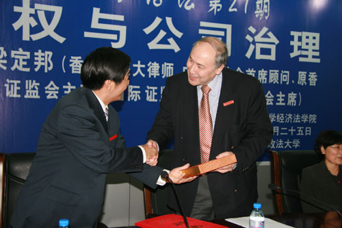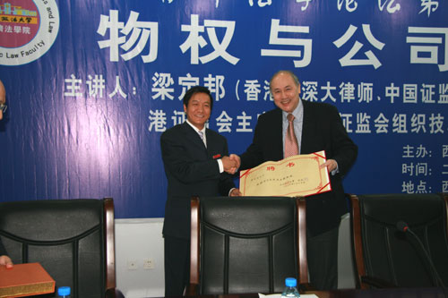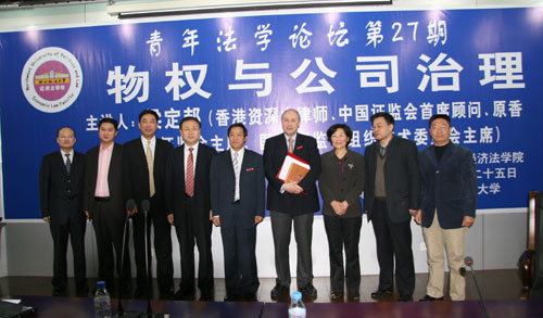 2008年3月25日(星期二)上午,beat365平台官方网站经济法学院青年法学论坛第27期在长安校区行政楼学术报告厅隆重举行。本期主题为《物权与公司治理》,香港资深大律师、中国证监会首席顾问、原香港证监会主席、国际证监会组织技术委员会主席梁定邦先生主讲。beat365平台官方网站经济法学院、民商法学院、经济管理学院等各学院研究生、本科生及来自西安地区的人大、政协、政府机关、监管机构、法院、上市公司、银行、证券、信托机构和西北大学、长安大学、西安体育学院、陕西师范大学、陕西政法管理干部学院等高校的领导、专家300余人参加了论坛。beat365平台官方网站校友、中国社科院法学研究所民法室主任孙宪忠教授出席了论坛。