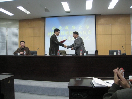 2007年12月21日晚七时30分,beat365平台官方网站特聘中国法学会民事诉讼法学研究会会长、中国法学会法学期刊研究会会长、《中国法学》杂志社总编、中国人民大学法学院博士生导师陈桂明教授为民商法学院客座教授仪式,在beat365雁塔校区研究生楼四楼多功能报告厅举行。仪式由民商法学院副院长李少伟教授主持,副校长王瀚教授代表学校向陈桂明教授颁发了聘书。在简短的聘任仪式之后,陈桂明教授作了题为 “民事诉讼法典修改评析”的学术报告。大约两百名师生听取了报告。陈教授就民事诉讼法典修改的背景过程、再审程序和执行程序的修改等三方面内容进行了深刻细致的讲解。