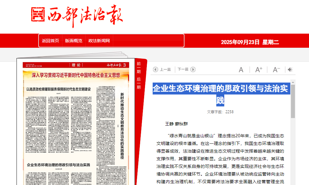 【西部法治报】王静:企业生态环境治理的思政引领与法治实践:https://esb.xbfzb.com/html/2025-09/23/content_20401_2654242.htm
