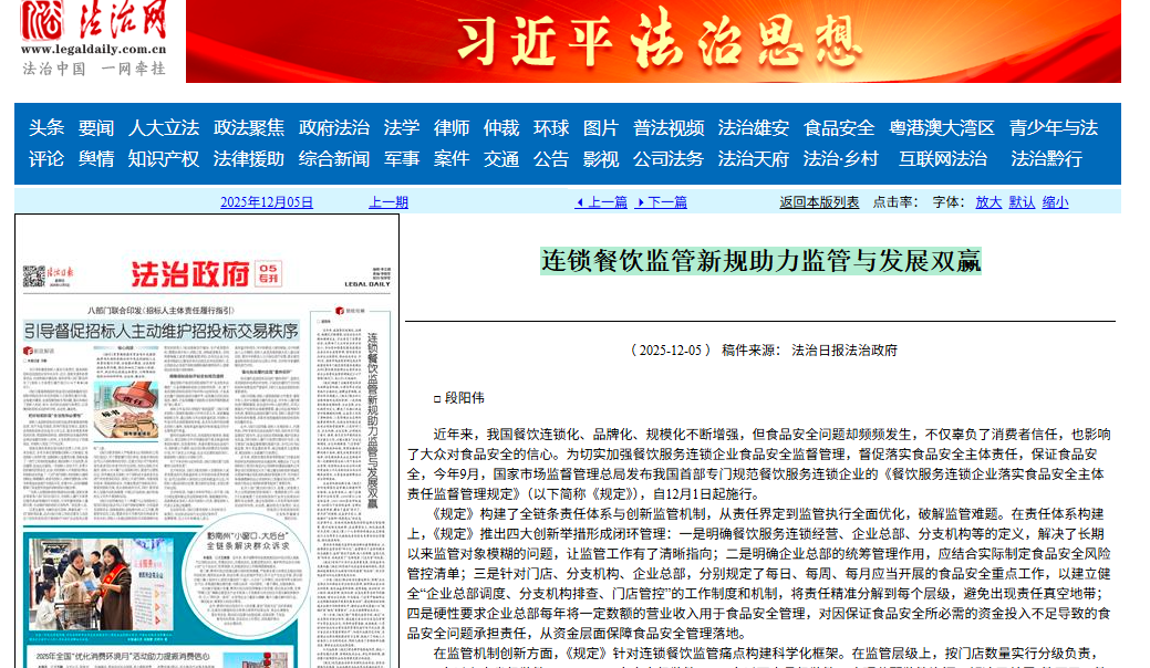 【法制网】段阳伟:连锁餐饮监管新规助力监管与发展双赢:http://epaper.legaldaily.com.cn/fzrb/content/20251205/Articel05003GN.htm