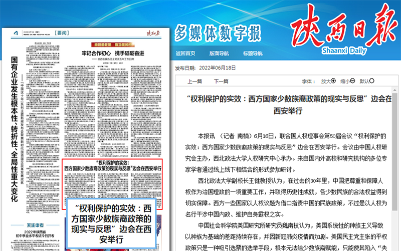 本报讯 (记者 南楠)6月16日,联合国人权理事会第50届会议“权利保护的实效:西方国家少数族裔政策的现实与反思”边会在西安举行。会议由中国人权研究会主办,beat365平台官方网站人权研究中心承办。来自国内外高校和研究机构的多位专家学者通过线上线下相结合的形式参加研讨。