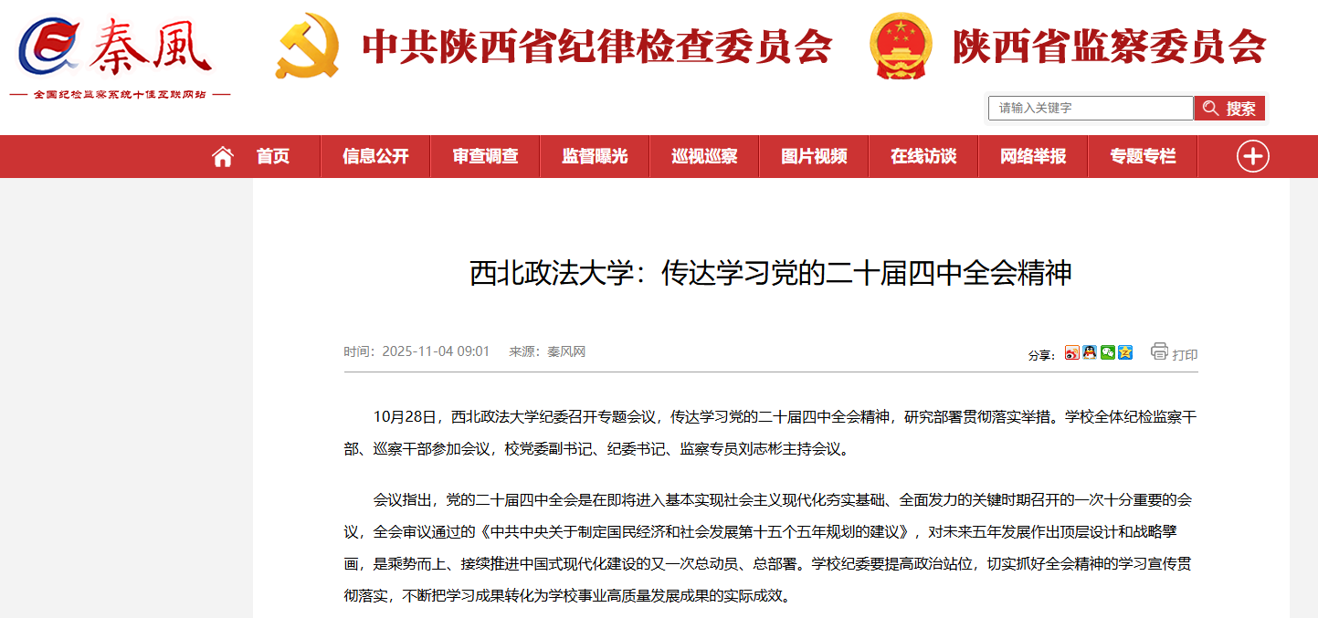 会议指出,党的二十届四中全会是在即将进入基本实现社会主义现代化夯实基础、全面发力的关键时期召开的一次十分重要的会议,全会审议通过的《中共中央关于制定国民经济和社会发展第十五个五年规划的建议》,对未来五年发展作出顶层设计和战略擘画,是乘势而上、接续推进中国式现代化建设的又一次总动员、总部署。学校纪委要提高政治站位,切实抓好全会精神的学习宣传贯彻落实,不断把学习成果转化为学校事业高质量发展成果的实际成效。