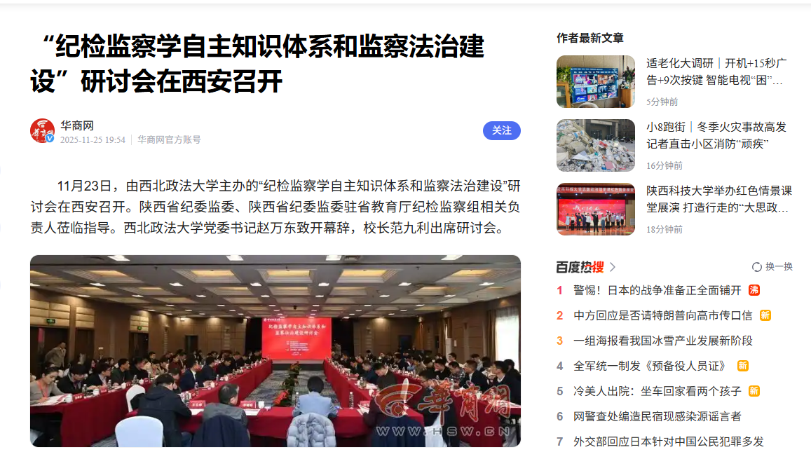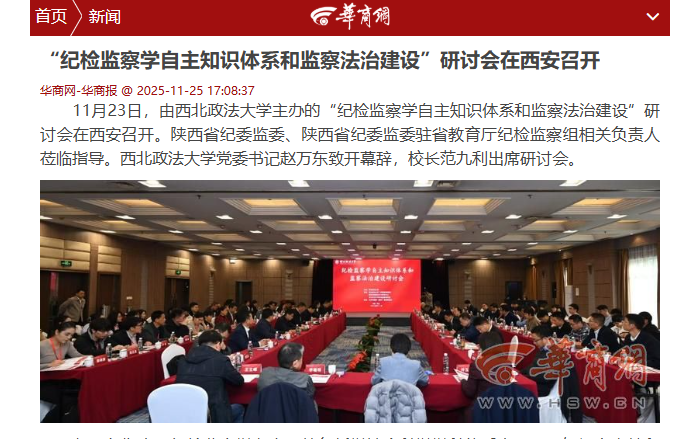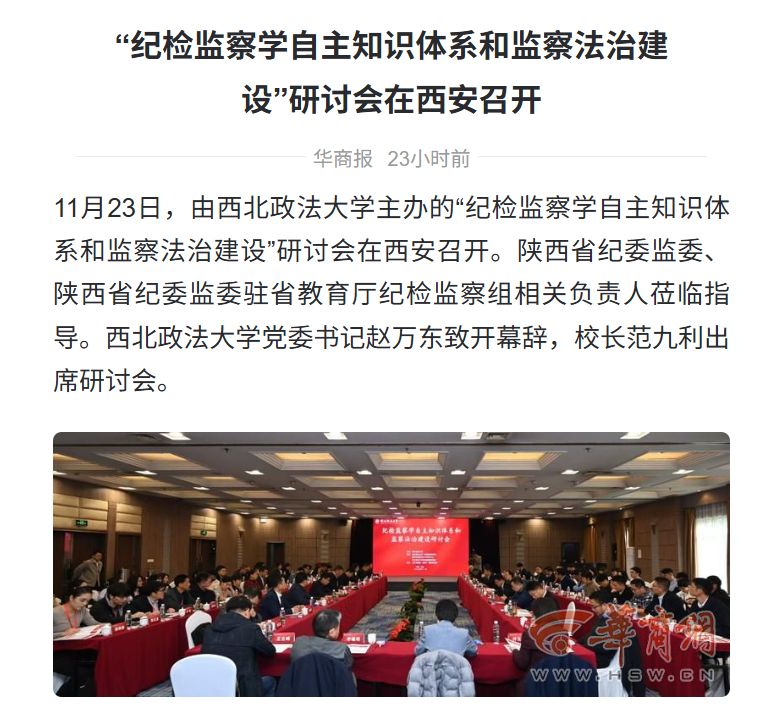 【政法新闻网】“纪检监察学自主知识体系和监察法治建设”研讨会在西安召开 https://www.xbfzb.com/2025-11/25/content_11424278.html 【中国日报网】“纪检监察学自主知识体系和监察法治建设”研讨会在西安召开https://shx.chinadaily.com.cn/a/202511/25/WS69251ebaa310942cc499328a.html 【科学网】“纪检监察学自主知识体系和监察法治建设”研讨会在西安召开https://news.sciencenet.cn/htmlnews/2025/11/555840.shtm 【陕西农村网】“纪检监察学自主知识体系和监察法治建设”研讨会在西安召开 https://www.sxncb.com/2025-11/25/content_11424911.html 【秦风】“纪检监察学自主知识体系和监察法治建设”研讨会在西安召开https://qinwen.sanqin.com/app/template/displayTemplate/news/newsDetail/7130/11424909.html?isShare=true 【三秦网】“纪检监察学自主知识体系和监察法治建设”研讨会在西安召开https://www.sanqin.com/2025-11/25/content_11424907.html 【群众新闻】“纪检监察学自主知识体系和监察法治建设”研讨会在西安召开https://xzzsx.sxdaily.com.cn/app/template/displayTemplate/news/newsDetail/7357/11424937.html?isShare=true 【西部网】“纪检监察学自主知识体系和监察法治建设”研讨会在西安召开http://m.cnwest.com/jyzx/a/2025/11/25/23243603.html 【人民日报全媒体】“纪检监察学自主知识体系和监察法治建设”研讨会在西安召开 https://www.msweekly.com/mobile/show.html?id=178476 【中华网】“纪检监察学自主知识体系和监察法治建设”研讨会在西安召开https://m.business.china.com/toutiao/13004642/20251125/49020520.html