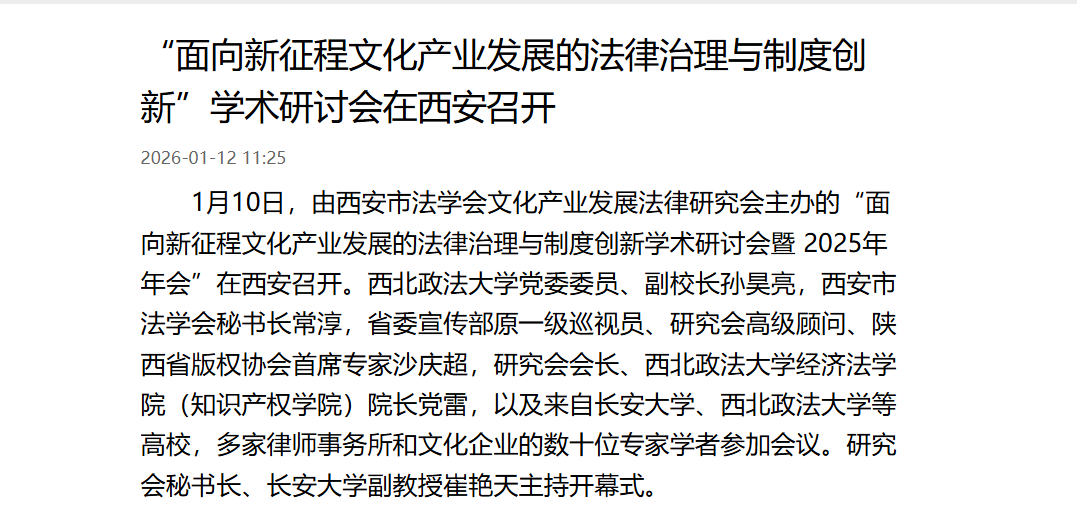 【政法新闻网】“面向新征程文化产业发展的法律治理与制度创新”学术研讨会在西安召开https://www.xbfzb.com/2026-01/11/content_11482225.html#10006-weixin-1-52626-6b3bffd01fdde4900130bc5a2751b6d1