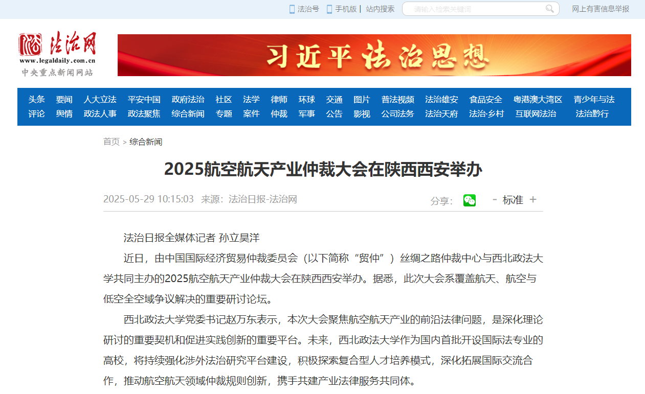 【法治网】2025航空航天产业仲裁大会在陕西西安举办 http://www.legaldaily.com.cn/index_article/content/2025-05/29/content_9190940.html