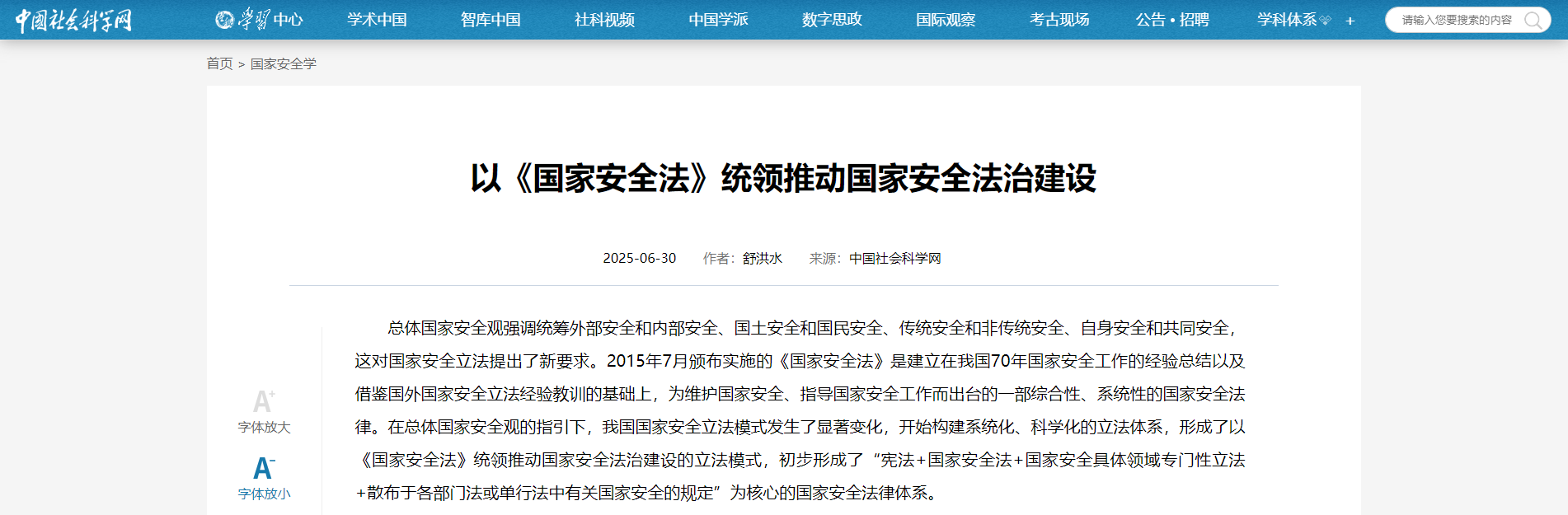 【中国社会科学网】舒洪水:https://www.cssn.cn/gjaqx/202506/t20250630_5883886.shtml以《国家安全法》统领推动国家安全法治建设