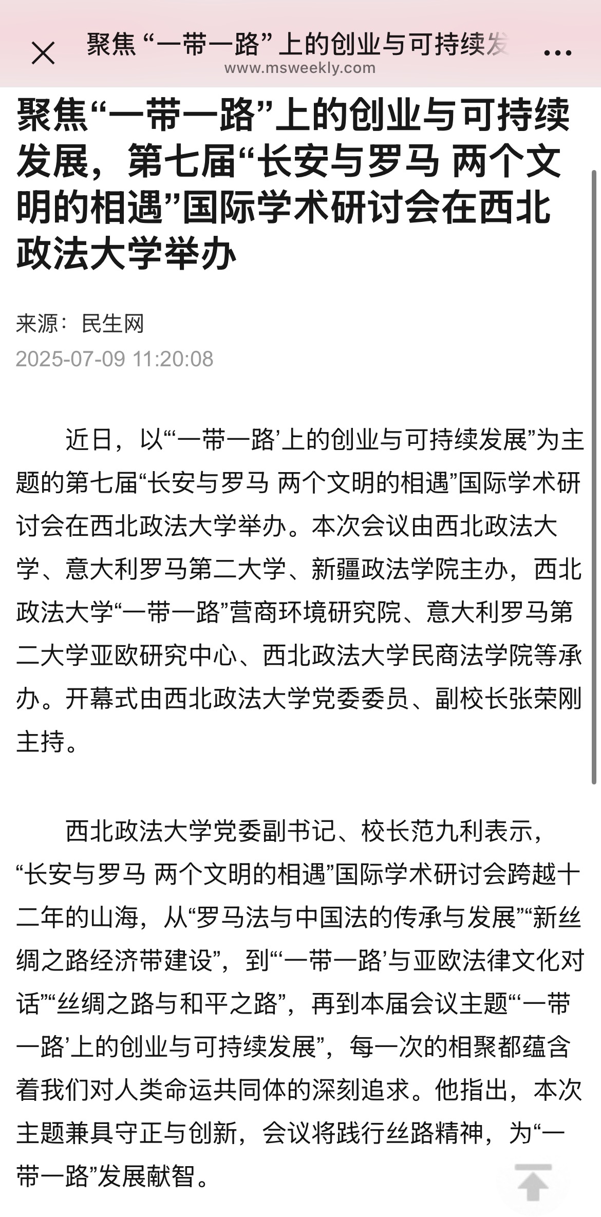 【民生网】聚焦“一带一路”上的创业与可持续发展,第七届“长安与罗马 两个文明的相遇”国际学术研讨会在beat365平台官方网站举办 http://www.msweekly.com/mobile/show.html?id=172858
