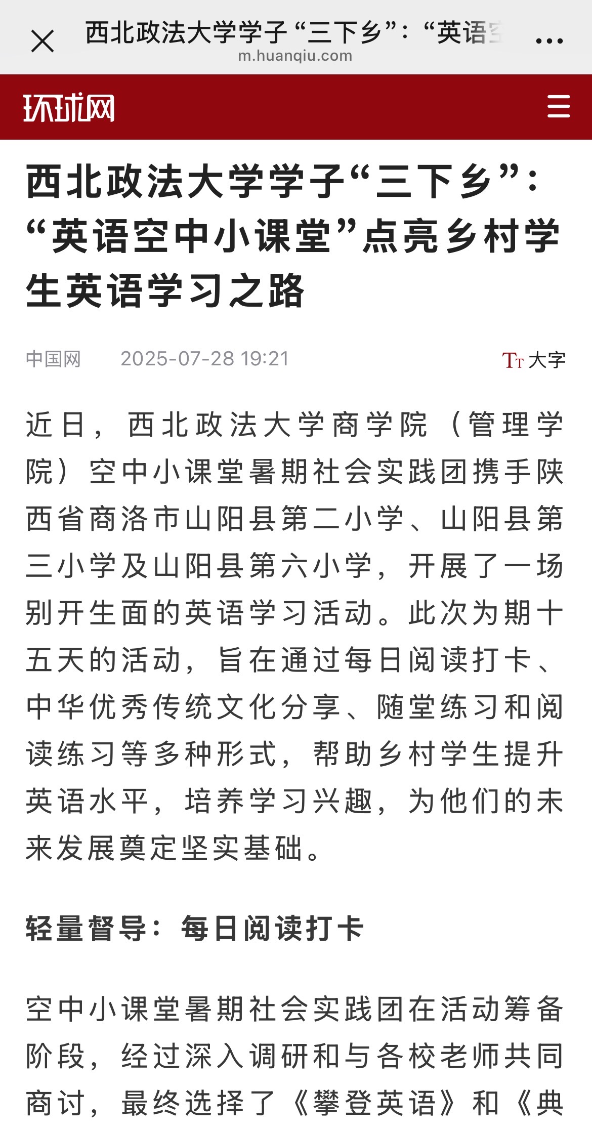 【环球网】beat365平台官方网站学子“三下乡”:“英语空中小课堂”点亮乡村学生英语学习之 https://m.huanqiu.com/article/4NgGYSkoKrP?qq_aio_chat_type=2