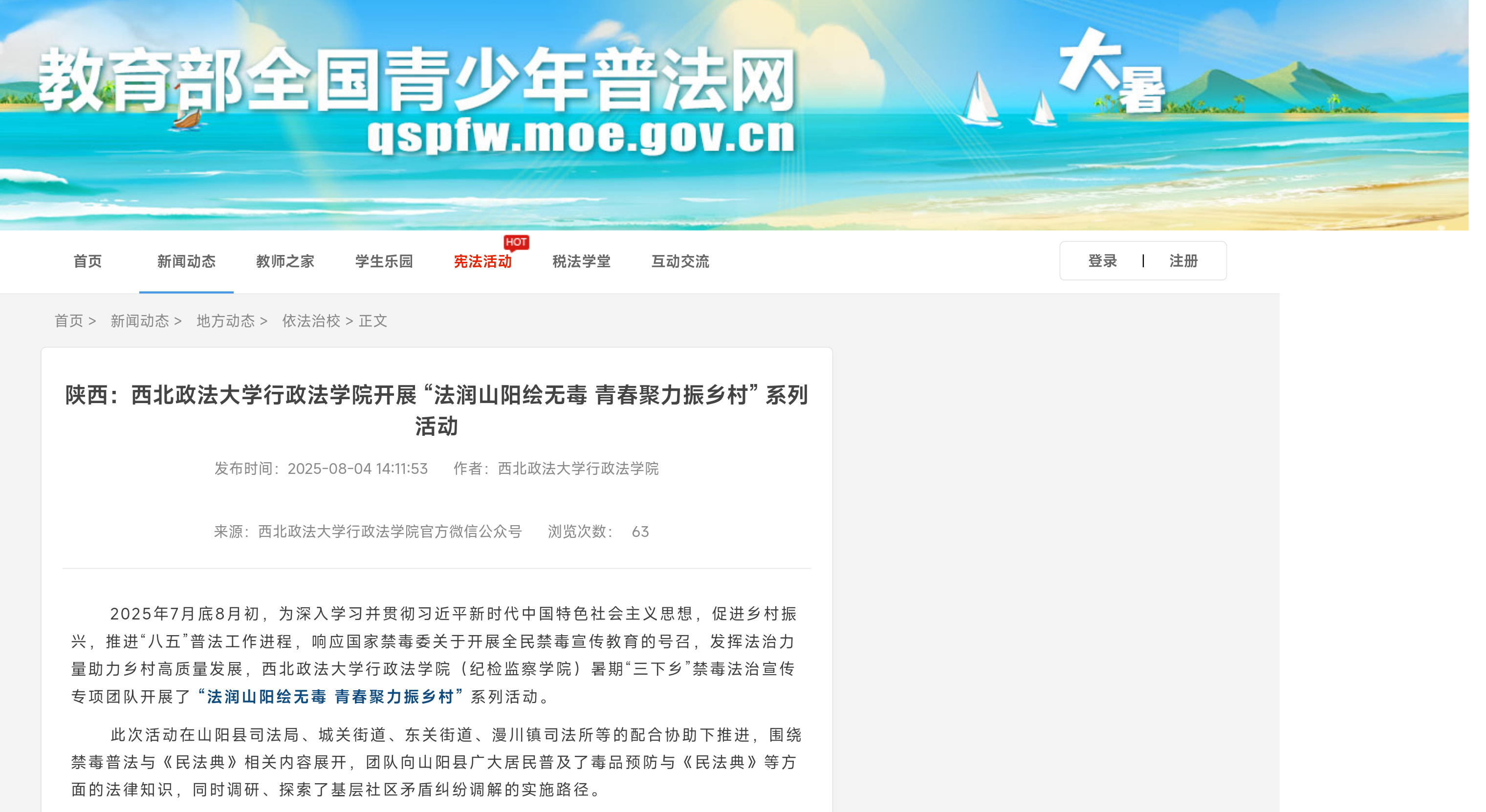 【教育部全国青少年普法网】陕西:beat365平台官方网站行政法学院开展 “法润山阳绘无毒 青春聚力振乡村” 系列活动 https://qspfw.moe.gov.cn/html/lawschool/20250804/23266.html