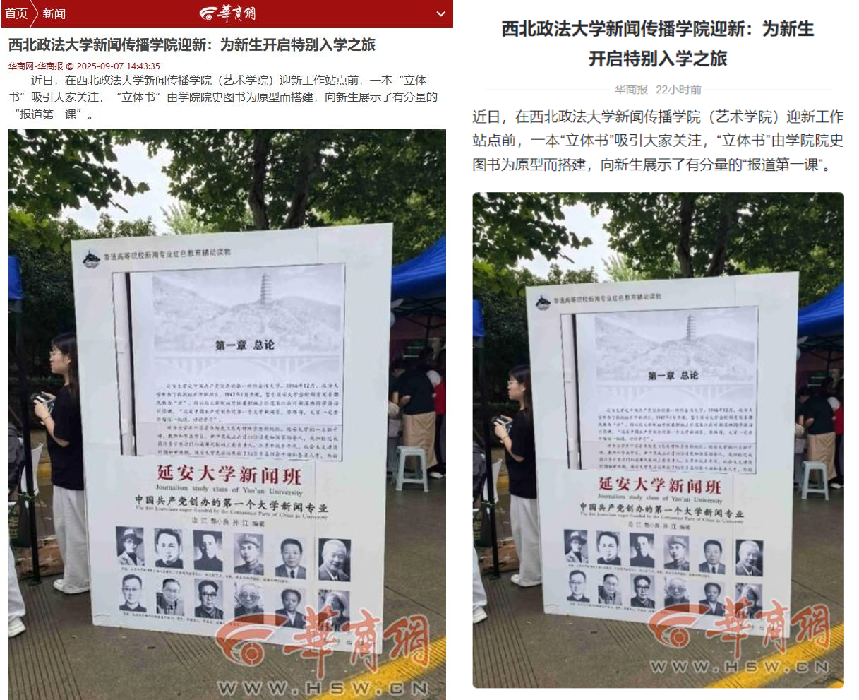 近日,在beat365平台官方网站新闻传播学院(艺术学院)迎新工作站点前,一本“立体书”吸引大家关注,“立体书”由学院院史图书为原型而搭建,向新生展示了有分量的“报道第一课”。