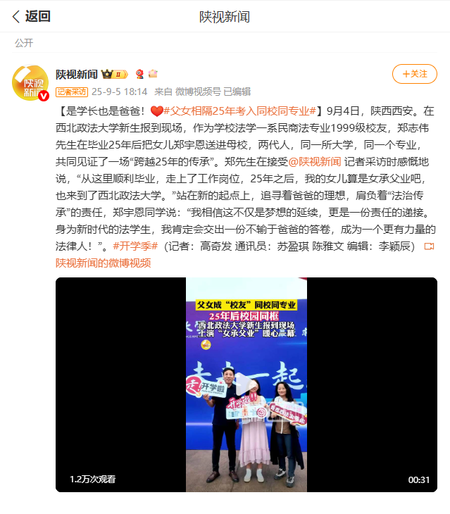 【陕视新闻】是学长也是爸爸!父女相隔25年考入同校同专业