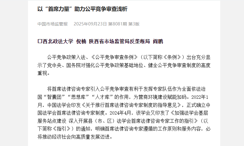 【中国市场监管报】倪楠:以“首席力量”助力公平竞争审查浅析:http://share.591adb.com/sharearticle/article/article_id/6257992/app_key/6025d79ccd2439641aebdcefc63c7eeb
