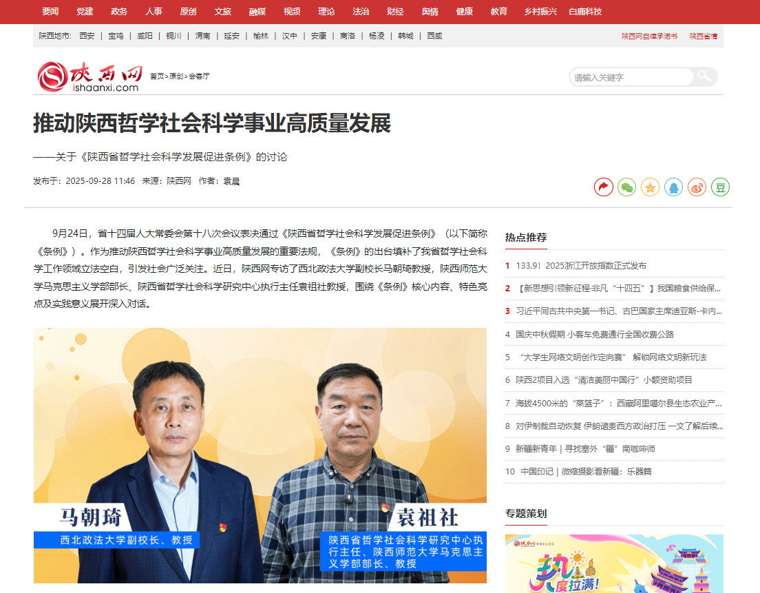 【陕西网】 推动陕西哲学社会科学事业高质量发展 ——关于《陕西省哲学社会科学发展促进条例》的讨论 https://www.ishaanxi.com/c/2025/0928/3522604.shtml