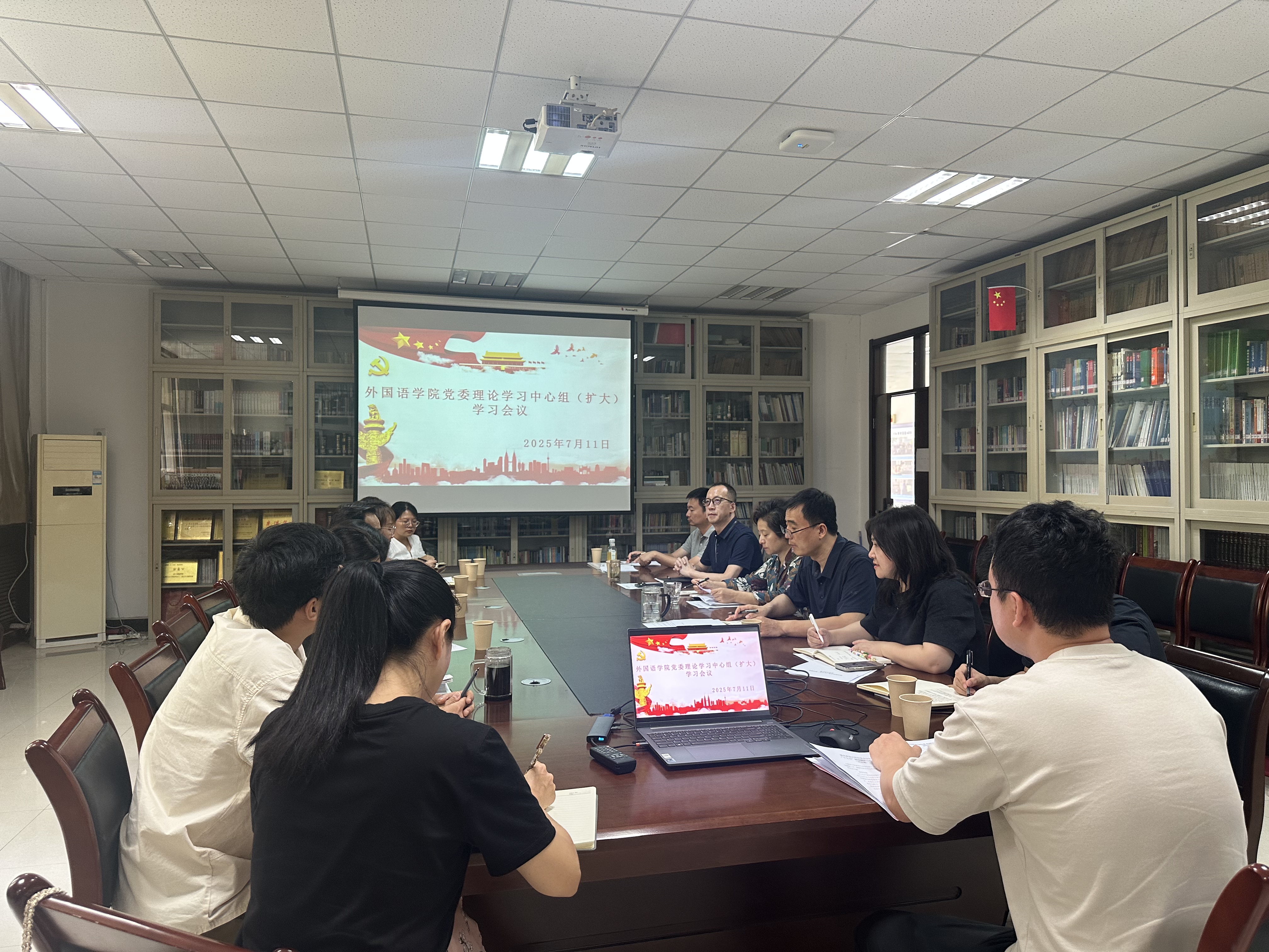 7月11日,外国语学院党委召开理论学习中心组(扩大)学习会议。学院领导班子成员、党支部书记、教研室主任、科级干部参加会议,学院党委书记杨华主持会议。