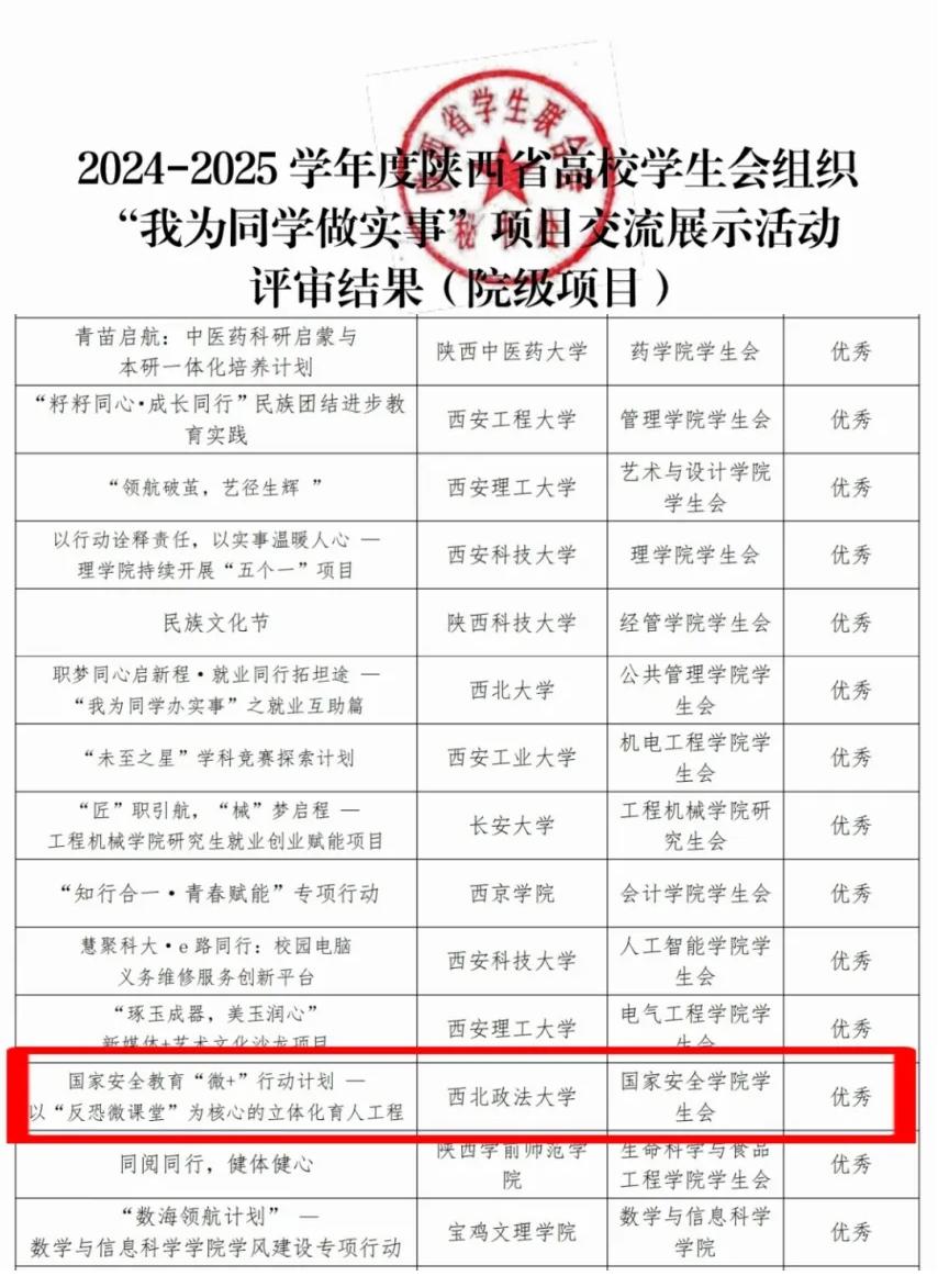 近日,陕西省学生联合会公布了2024-2025学年度“我为同学做实事”项目交流展示活动评审结果,国家安全学院(反恐怖主义法学院)学生会“国家安全教育‘微+’行动计划——以‘反恐微课堂’为核心的立体化育人工程”项目成功入选优质示范项目,获评“优秀”等次。