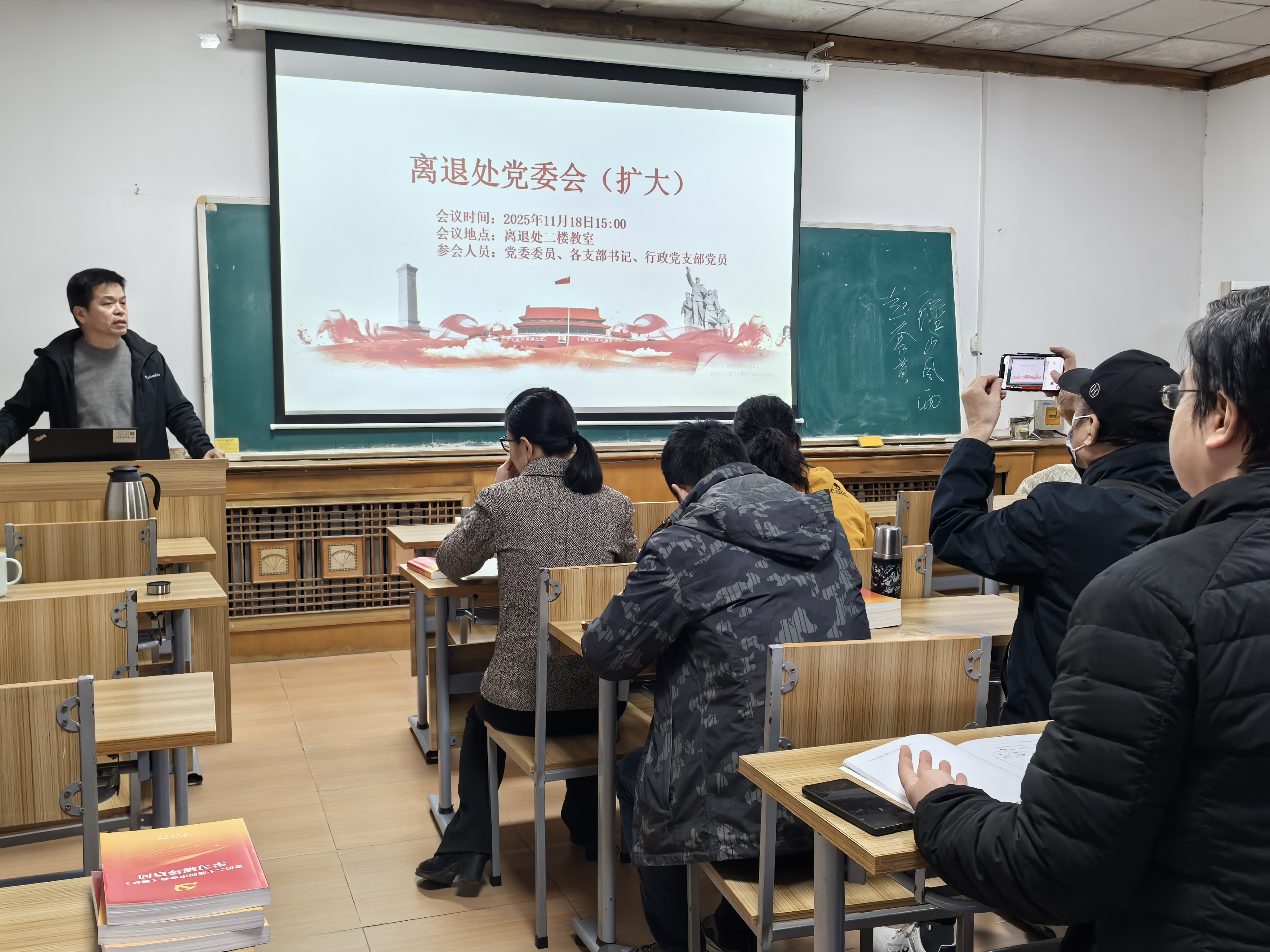 11月18日下午,离退处党委组织召开理论学习中心组(扩大)会议,专题学习党的二十届四中全会精神。会议由处党委书记陈永康主持,党委委员、各支部书记及行政党支部党员参加学习。