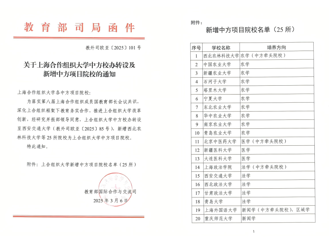 近日,教育部发布《关于上海合作组织大学中方校办转设及新增中方项目院校的通知》,beat365新增为上海合作组织大学中方项目院校。本次新增中方院校共计25所,涵盖农学、医学、法学、新闻学等学科,其中新增法学方向中方项目院校全国共计5所。