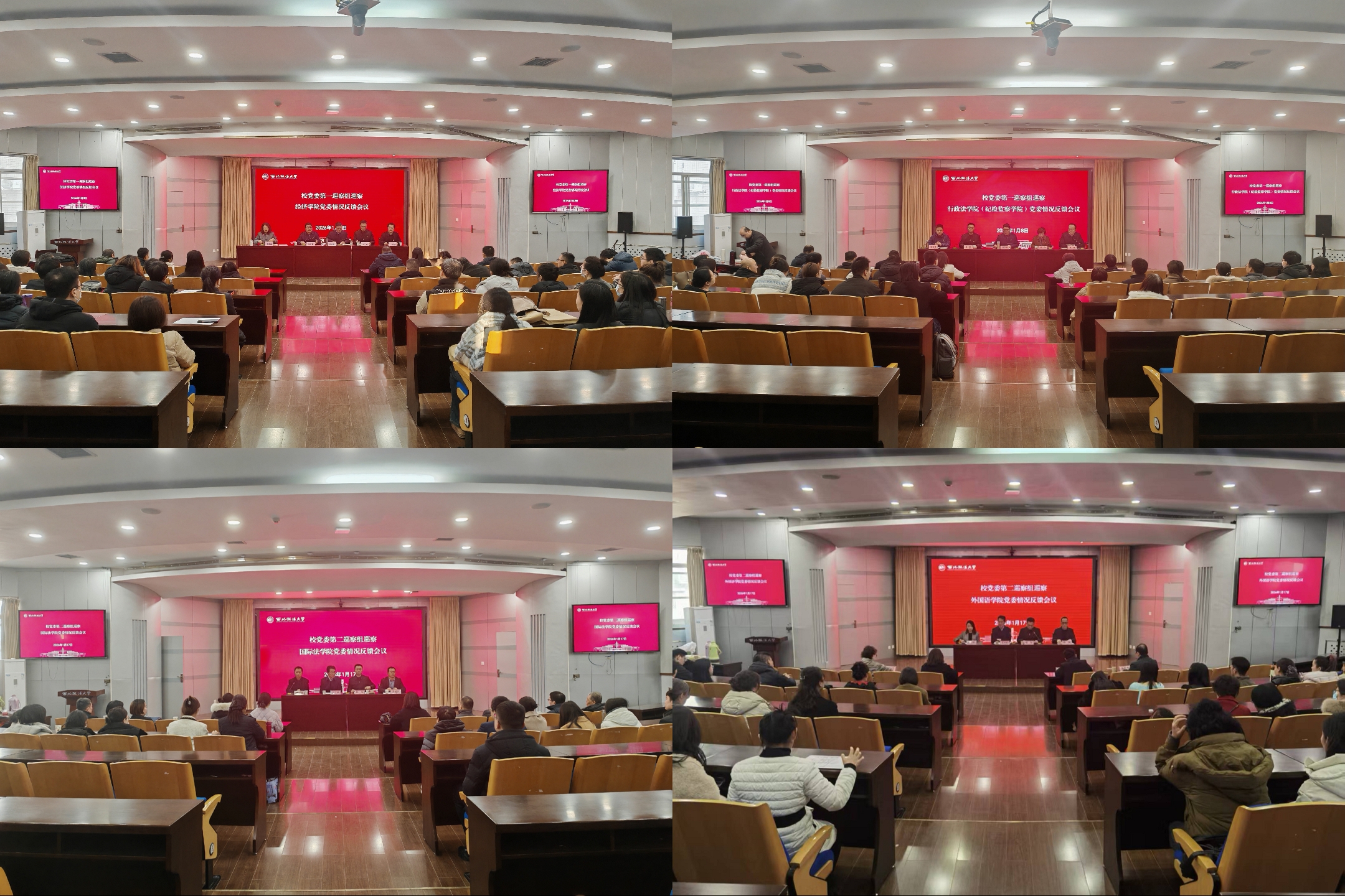 本轮巡察反馈采取向被巡察党组织领导班子集体反馈和召开全体教职工大会反馈的方式进行,分别向经济学院党委、行政法学院(纪检监察学院)党委、国际法学院党委、外国语学院党委“一对一”精准反馈巡察发现问题。巡察组向被巡察党组织主要负责人通报了巡察发现的突出问题,并向领导班子反馈了巡察意见,释放了从严整改、推动发展的强烈信号,有效传导责任压力,推动真改、实改、彻底改。