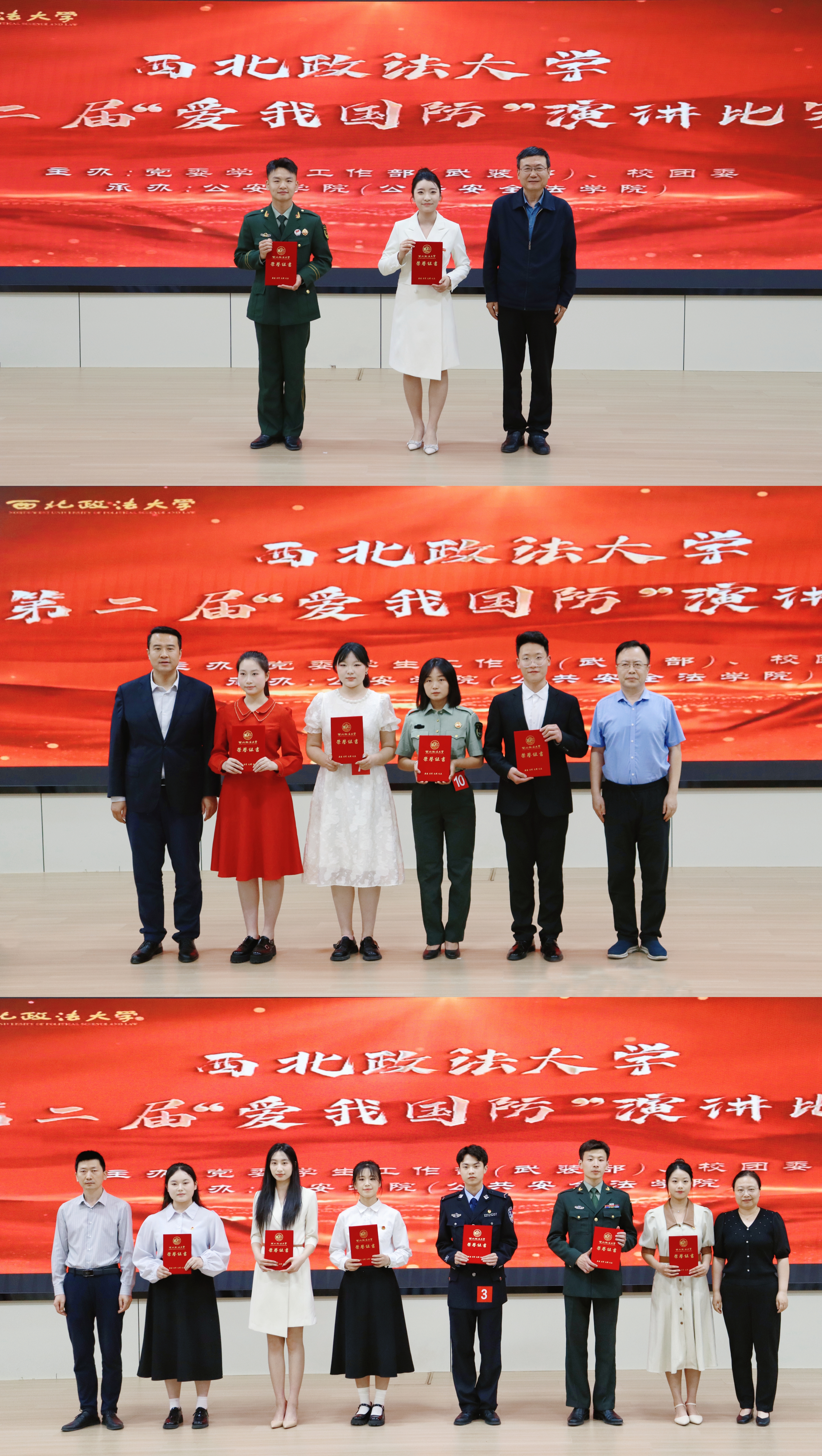 经过激烈角逐,国家安全学院(反恐怖主义法学院)赵佳梦、刑事法学院杜川荣获一等奖,经济法学院(知识产权学院)王麒斌、民商法学院李暄、新闻传播学院(艺术学院)张诺锡、经济学院谢雨涵荣获二等奖,民商法学院王迪、 新闻传播学院(艺术学院)李依哲、公安学院(公共安全法学院)苏煜航、刑事法学院吴寒宇、外国语学院刘韵涵、商学院(管理学院)何非洋荣获三等奖。