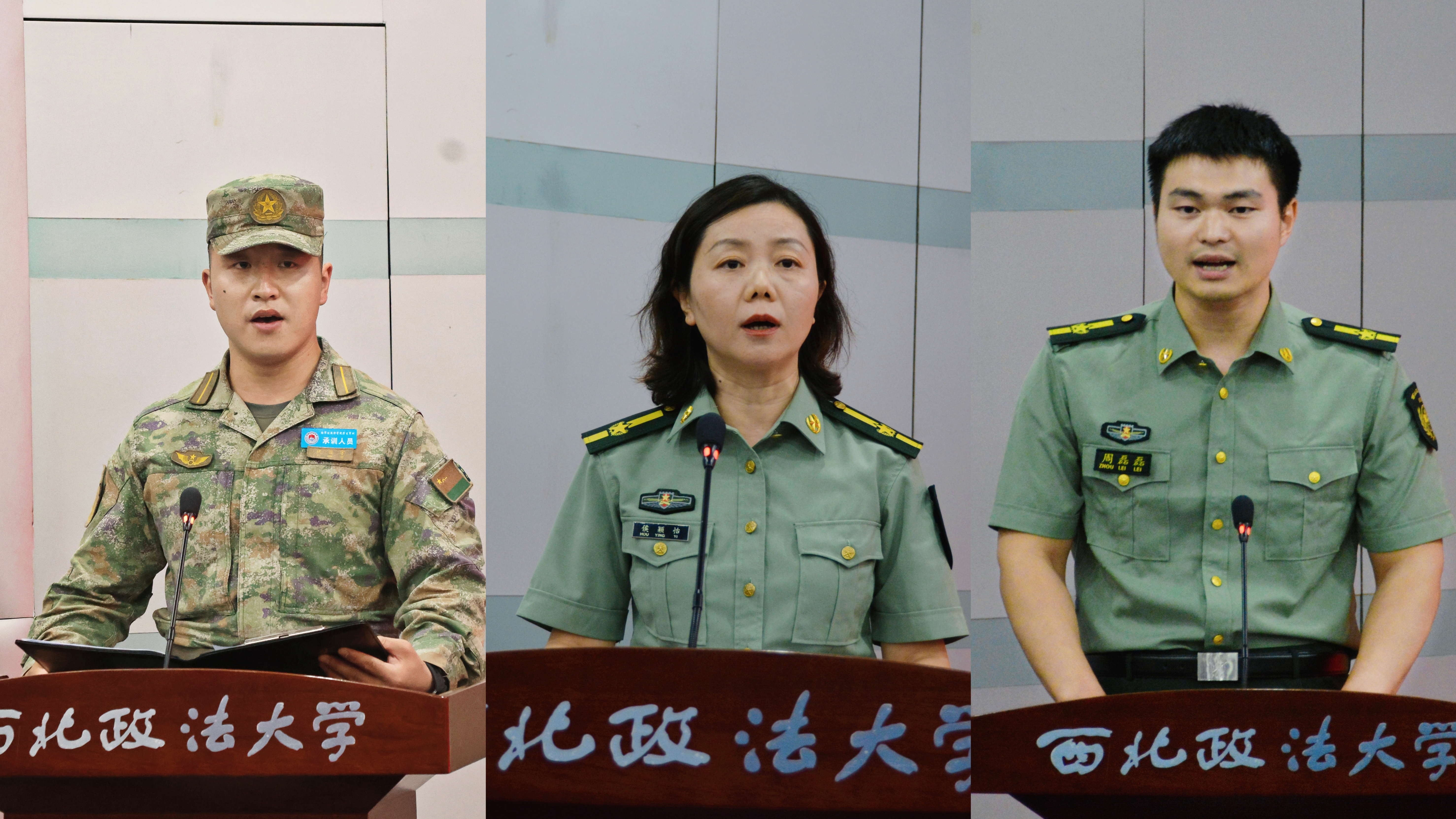 军训旅一团团长、陆军边海防学院伏效宇,二团政委、经济学院党委副书记侯颖怡,三团指导员、行政法学院(纪检监察学院)2025级辅导员周磊磊分别作表态发言