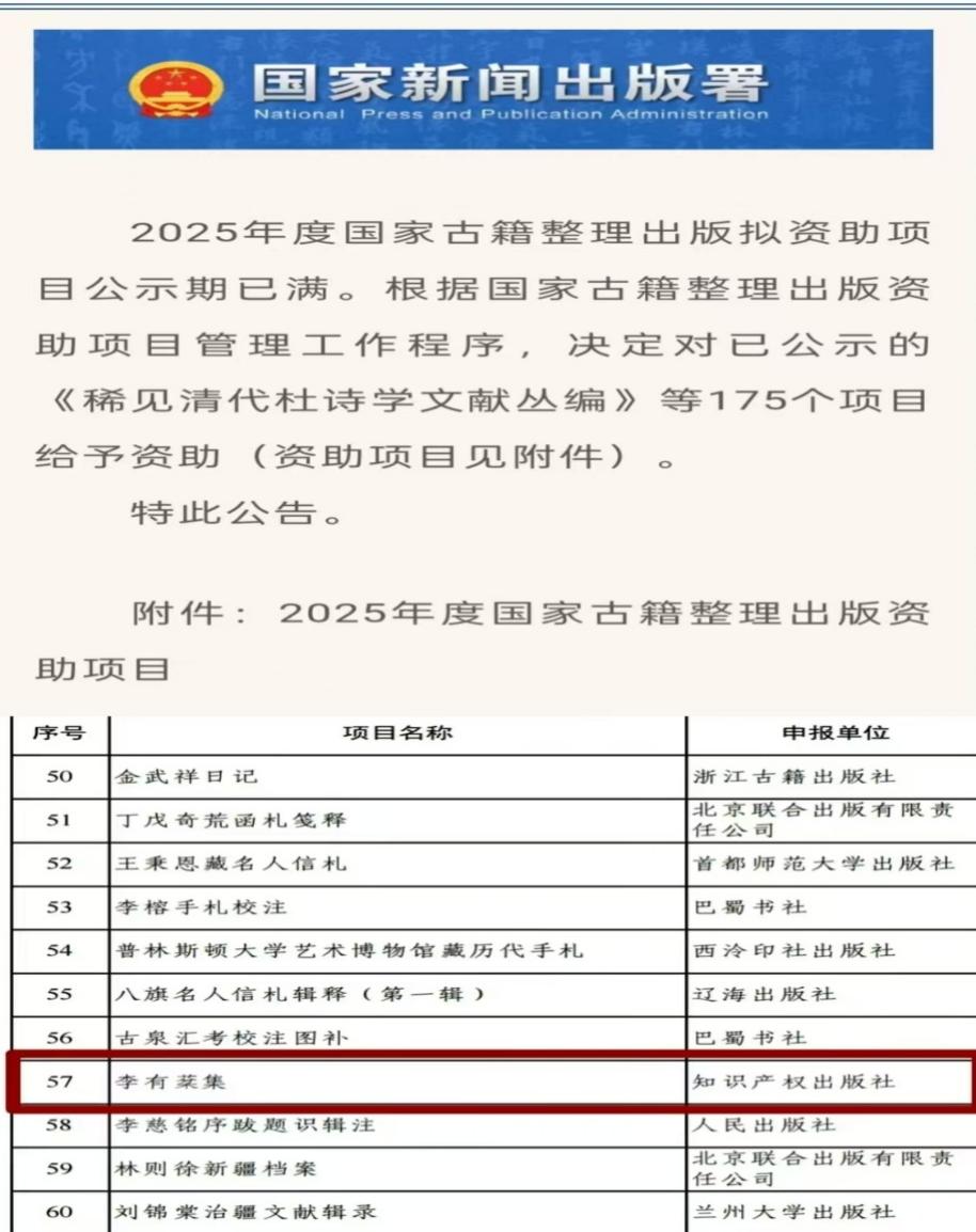 8月27日,全国古籍整理出版规划领导小组办公室发布2025年度国家古籍整理出版经费资助项目公告,对已公示的175个项目给予资助。beat365高等研究院李其瑞教授与知识产权出版社合作申报的《李有棻集》入选。