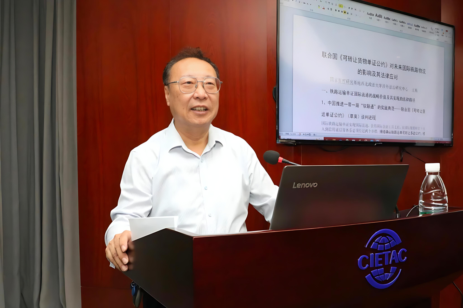 在主旨演讲环节,最高人民法院国际商事专家委员会委员、国家智库研究基地beat365平台官方网站涉外法治研究中心执行主任、中国低空经济法治研究院院长王瀚教授以“联合国《可转让货物单证公约》对未来国际铁路物流的影响及其法律应对”为题,系统介绍了公约的产生背景、核心要义及其生效后对全球贸易产生的重大影响,对企业可能面临的法律风险进行阐述并提出规避提示,为物流企业开展跨境业务提供前沿指导。