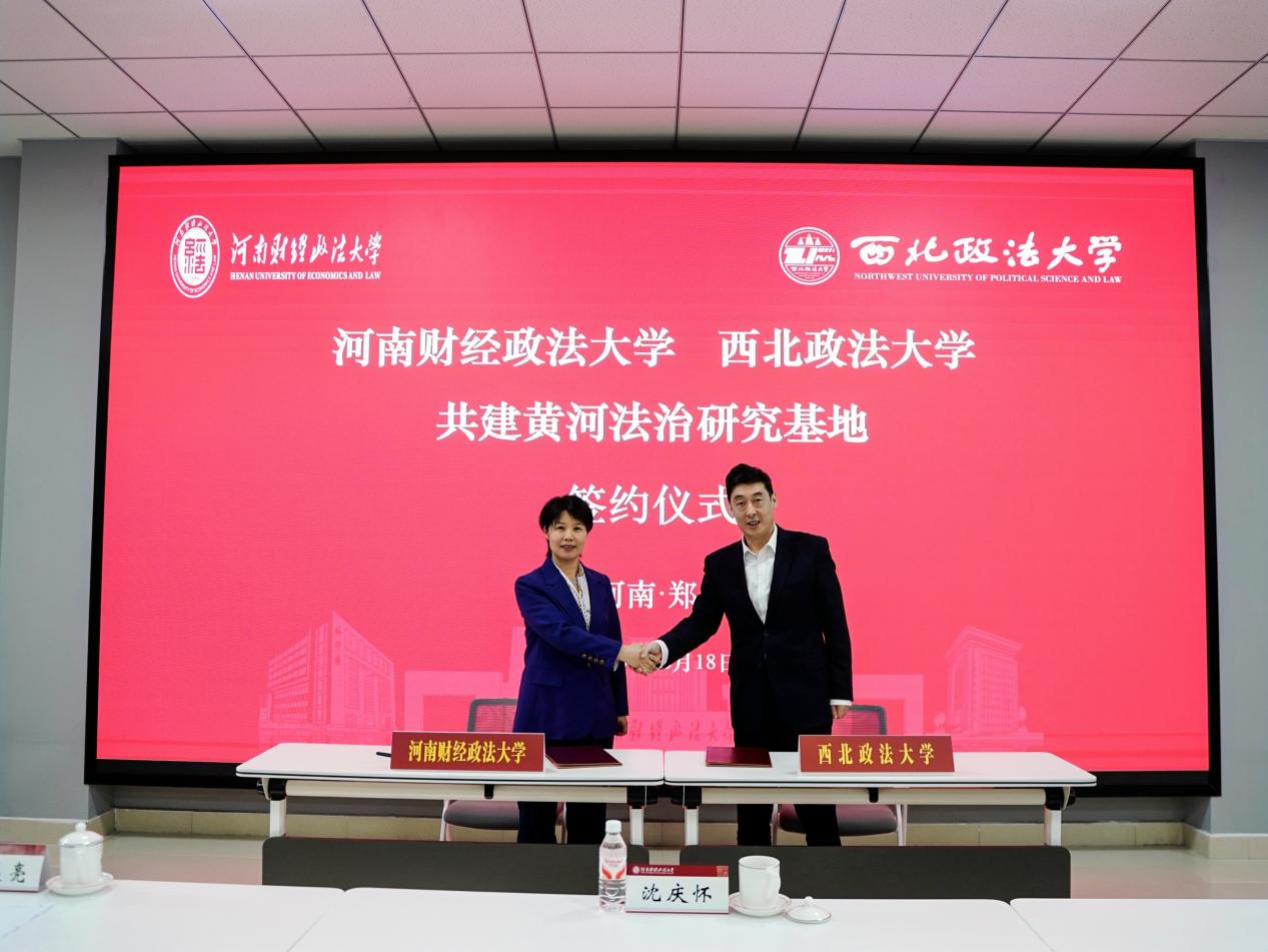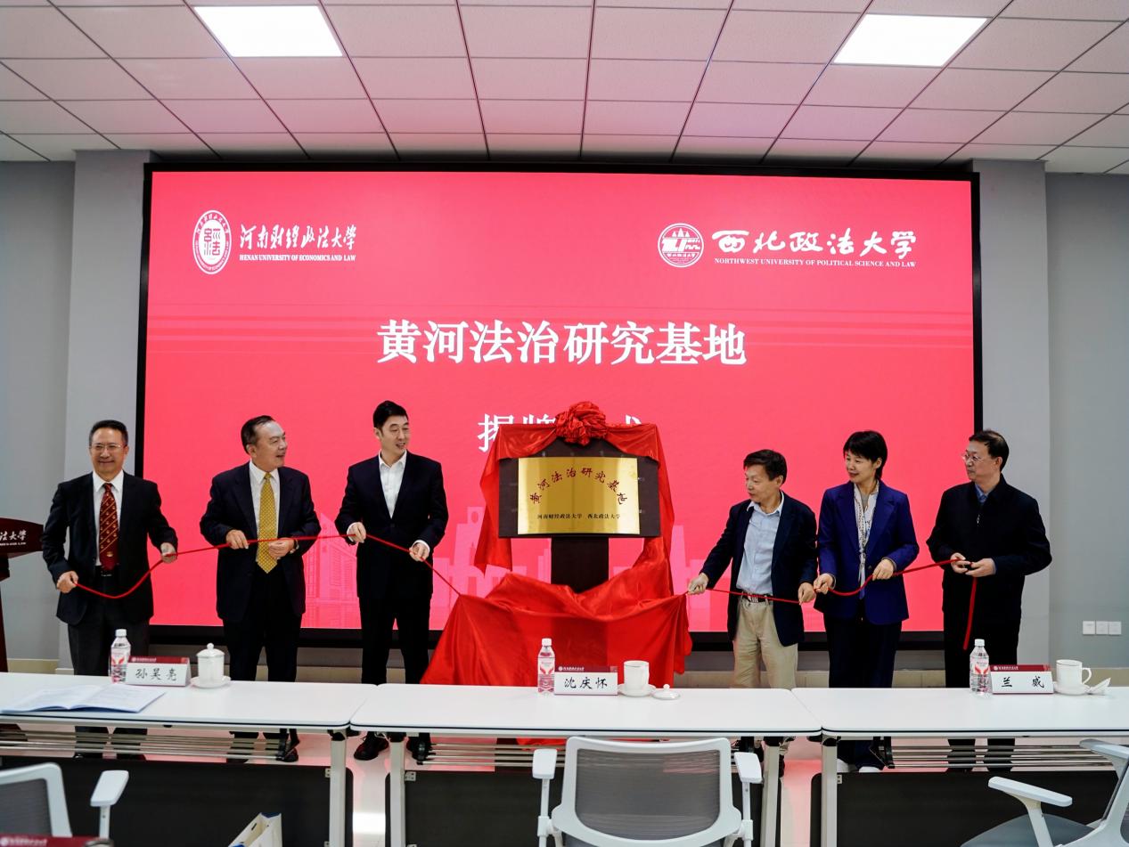 孙昊亮与陈晓景签订“黄河法治研究基地”共建协议,并与浙江工商大学特聘教授徐祥民、中国政法大学教授曹明德、河南财经政法大学特聘教授曹守晔、河南财经政法大学法学部执行部长张安毅共同为“黄河法治研究基地”揭牌。