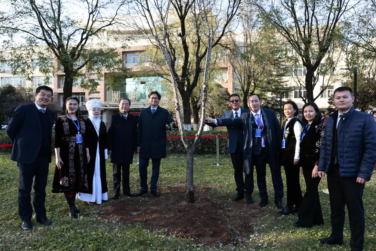 仪式结束后,与会领导与嘉宾共同栽种象征友谊的“中国—中亚法律文化互鉴同心树”。期间,中亚师生一行赴校史馆、习近平法治思想 “三进” 成果展览馆、模拟法庭及法学实验实训中心参观考察,通过实物史料、成果展示、实景体验等多元形式,全面了解学校法学教育的发展历程、理论创新实践及实训教学体系,深刻体悟中国特色法治教育的鲜明特质与育人理念。