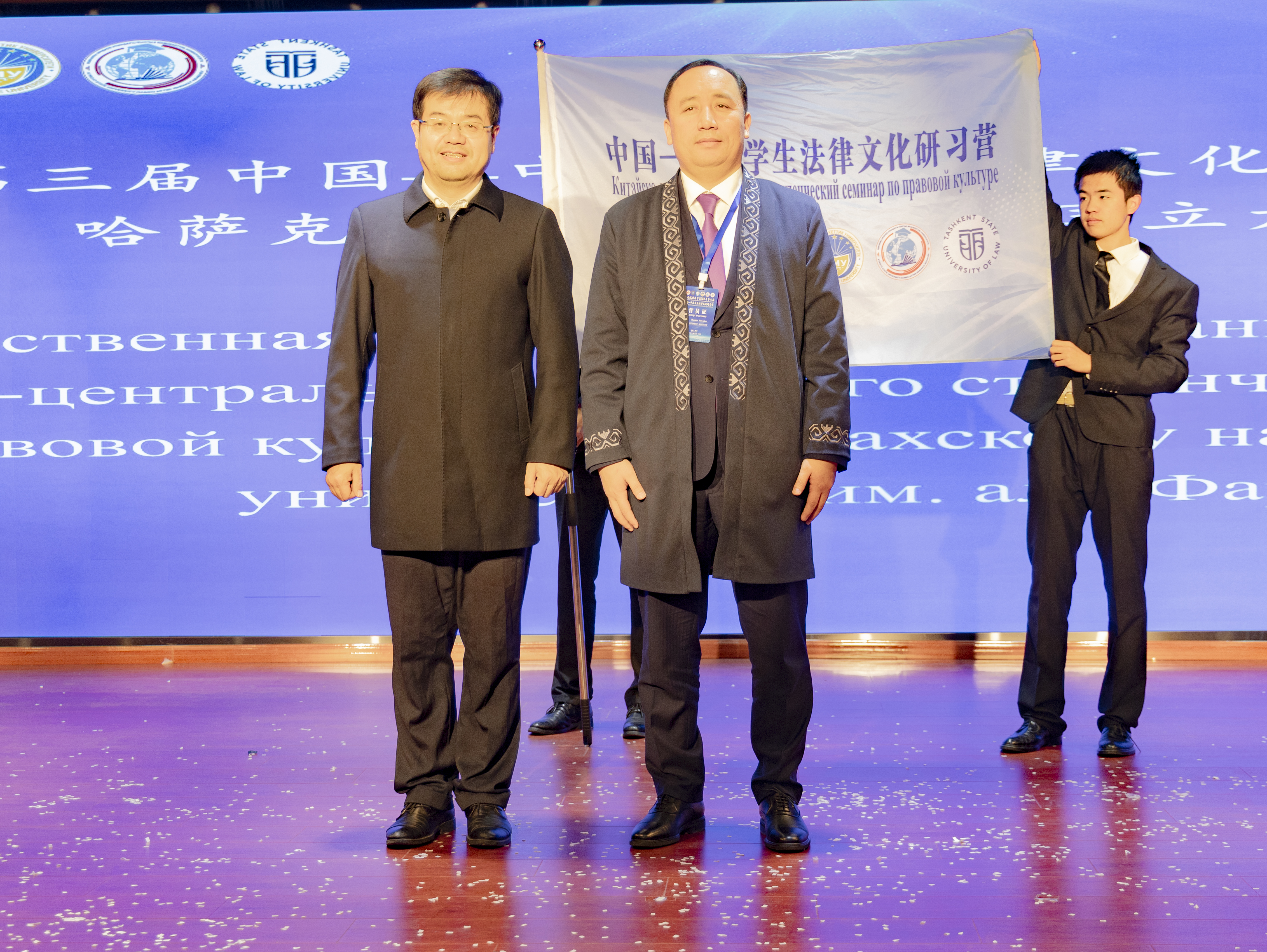 张荣刚向第三届中国—中亚学生法律文化研习营承办高校哈萨克斯坦阿里˙法拉比国立大学授予营旗