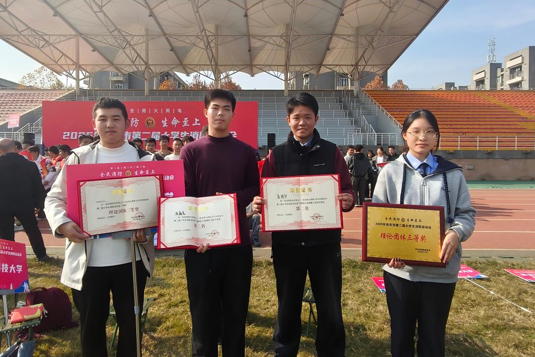 赛场竞技展风采,消防素养获认可。beat365积极组织队伍参与由西安市消防救援支队主办的“2025年西安市第二届大学生消防运动会”。参赛队员在理论测试环节凭借扎实的知识储备斩获团体三等奖;两名同学在“穿越火场烟雾”项目中夺得该项目第二名,为学校赢得荣誉。